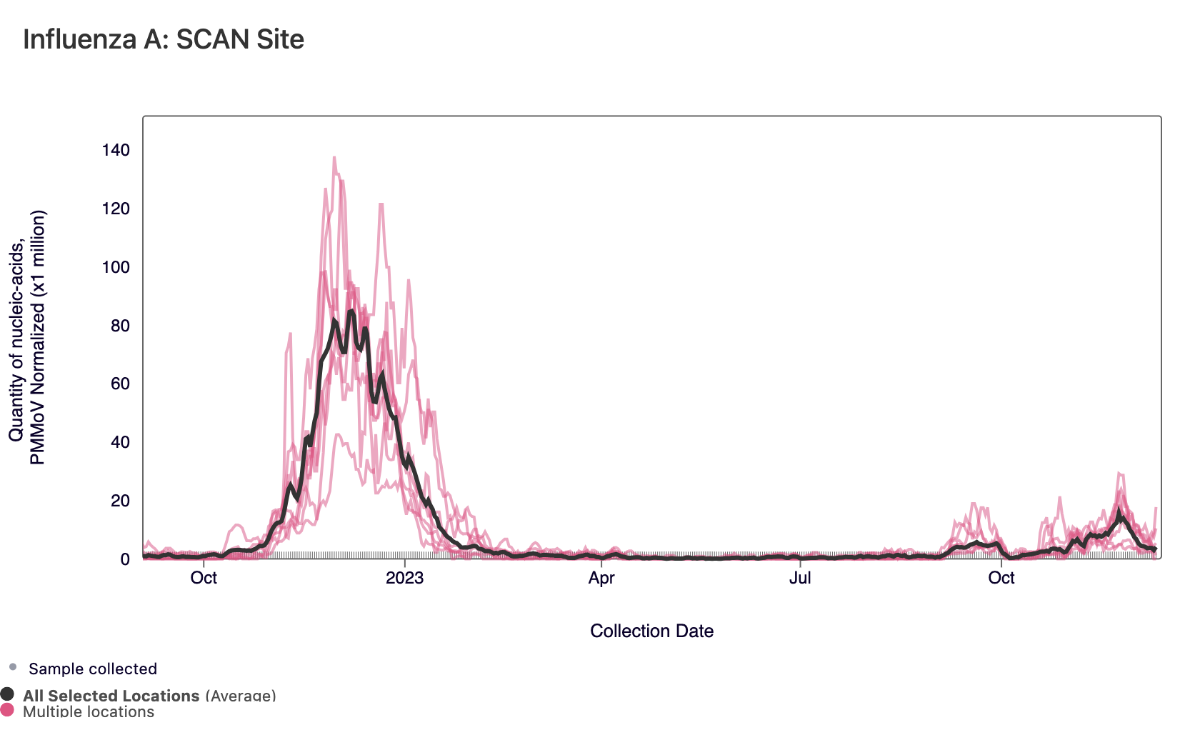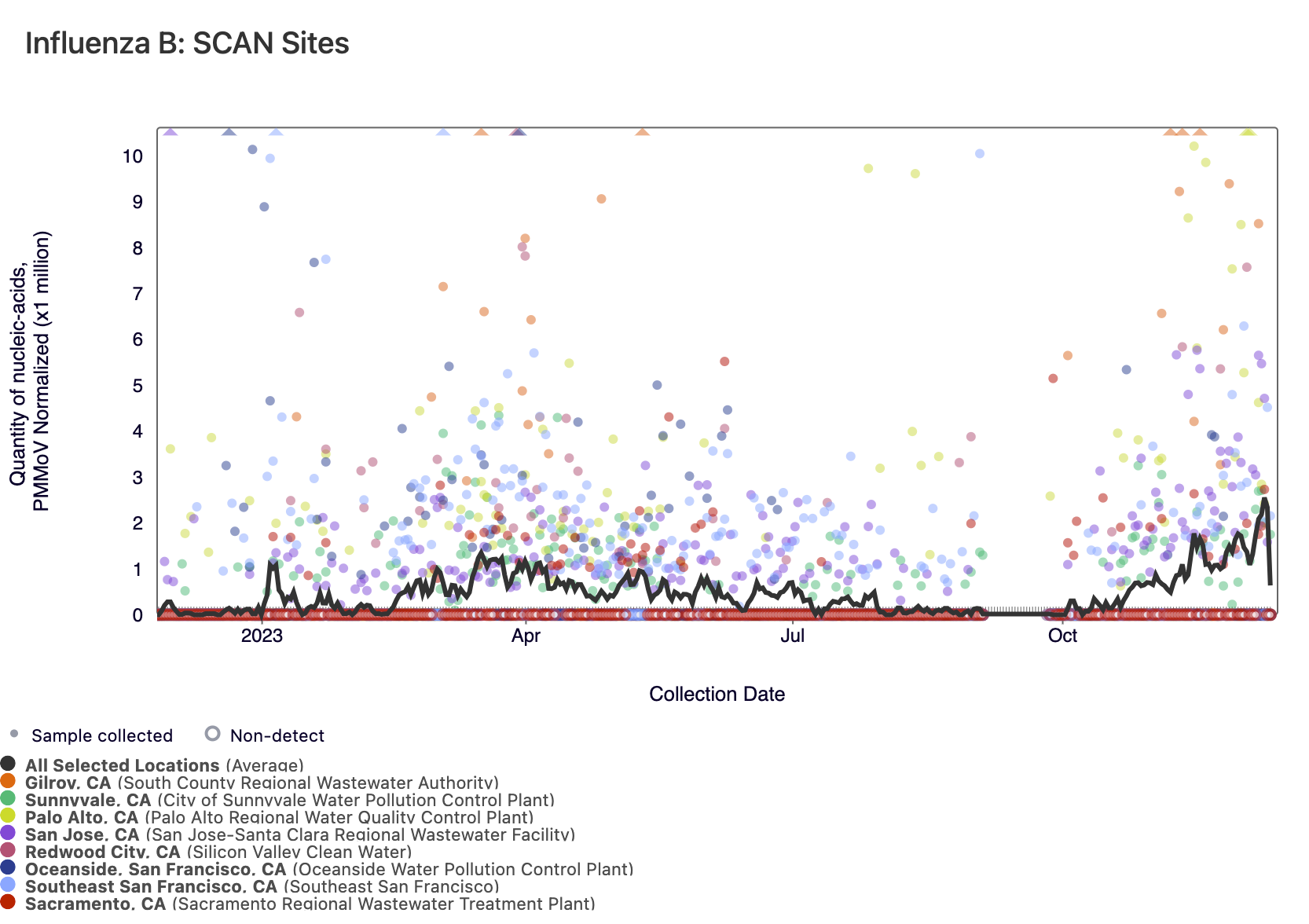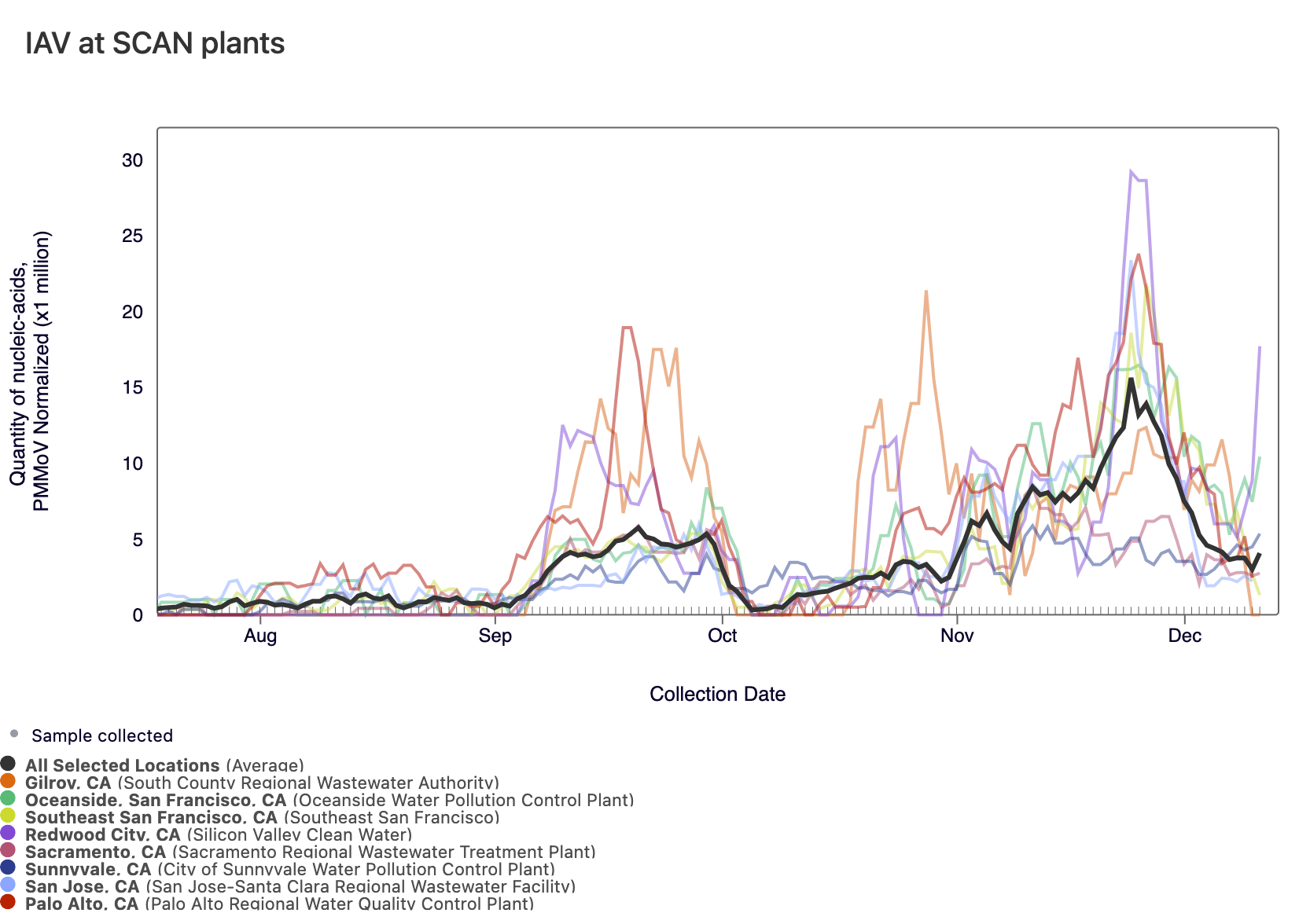 Influenza A (IAV) RNA concentrations are relatively high at most SCAN sites, and five sites have met the benchmark for wastewater onset (Sacramento, Palo Alto, San Jose, Sunnyvale, and, Oceanside SF). In the chart below, the population weighted average line across all the SCAN plants (black) is compared to the IAV concentrations at all SCAN sites since August.