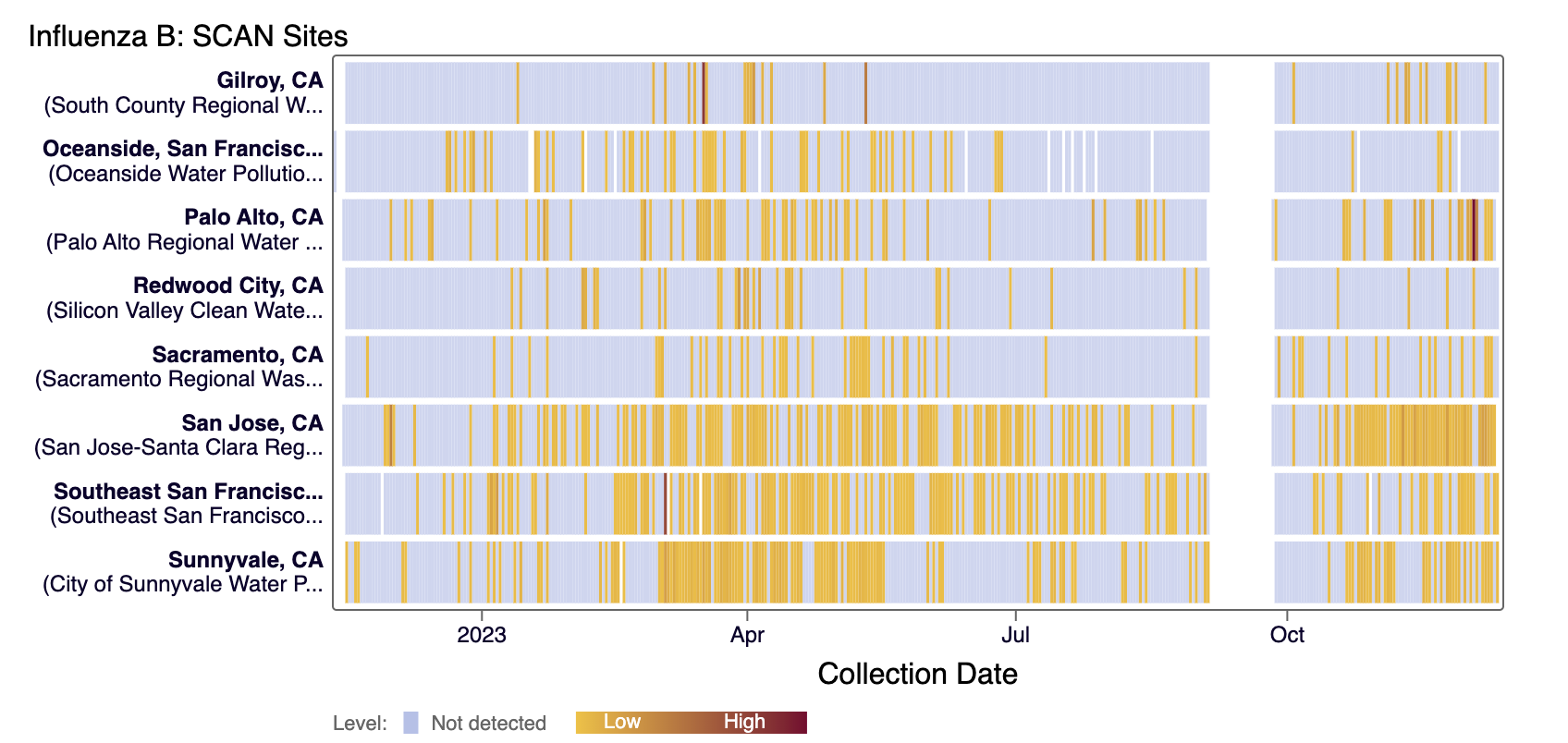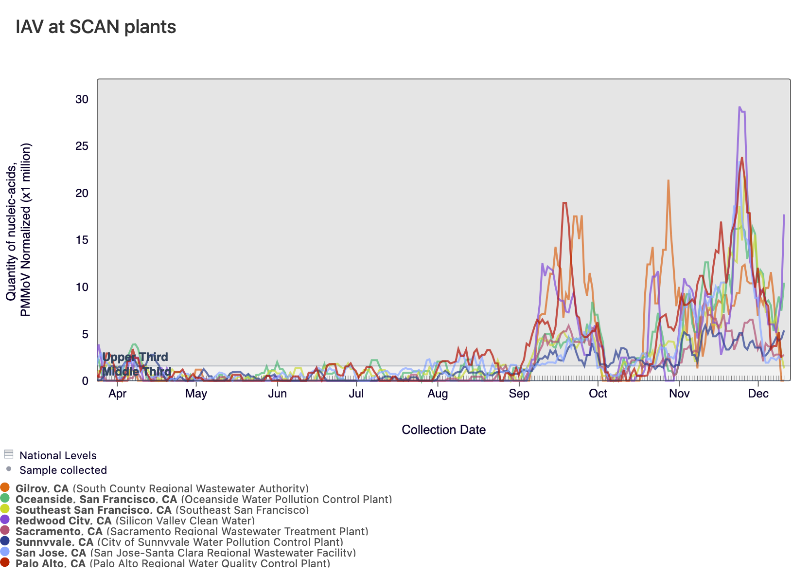 Below is a chart showing the National Levels benchmarks superimposed on the IAV data from the SCAN sites (you can access this chart here). Currently, Gilroy and Southeast SF have IAV concentrations in the middle third tier, and all other SCAN sites have IAV concentrations in the upper third level.