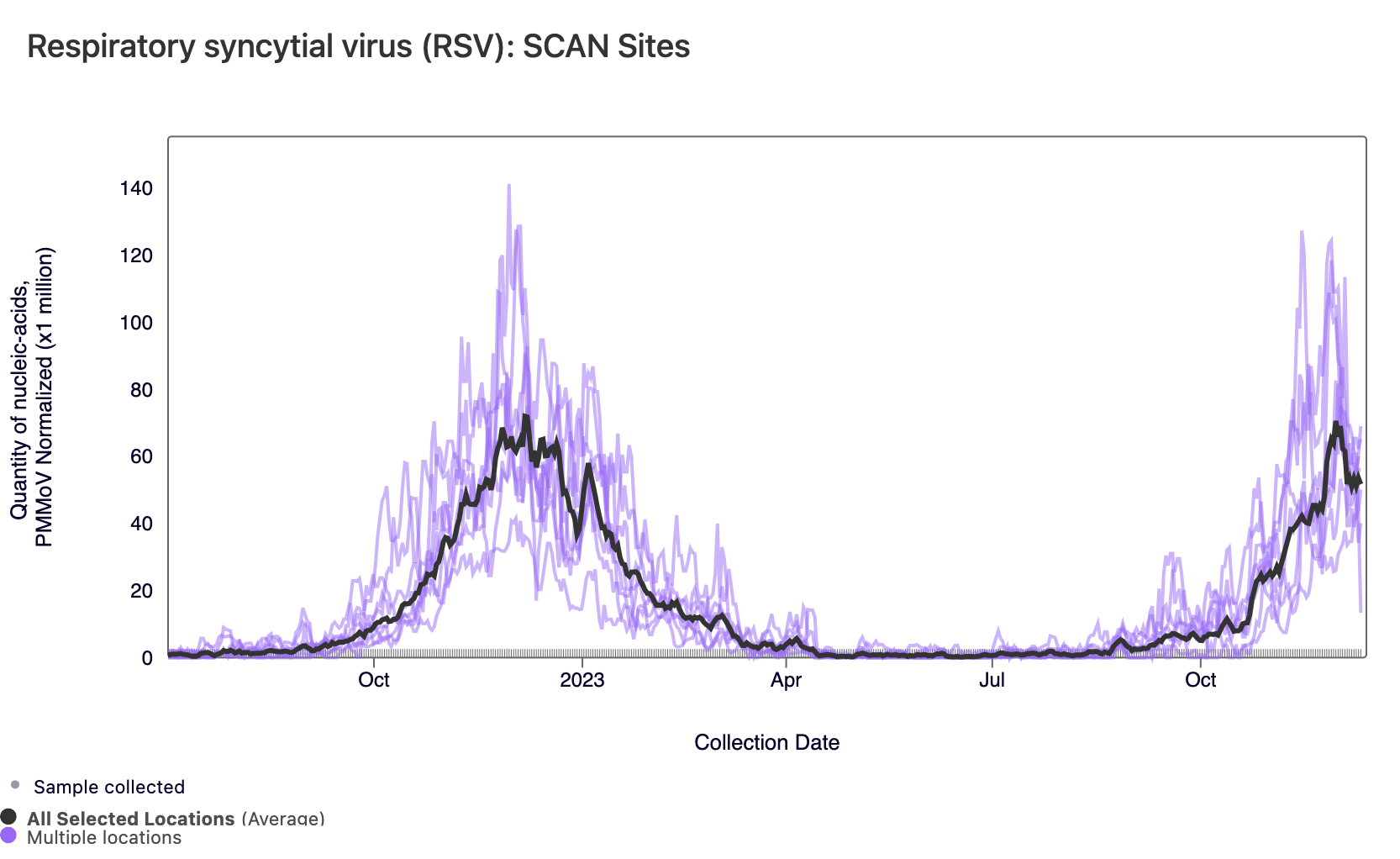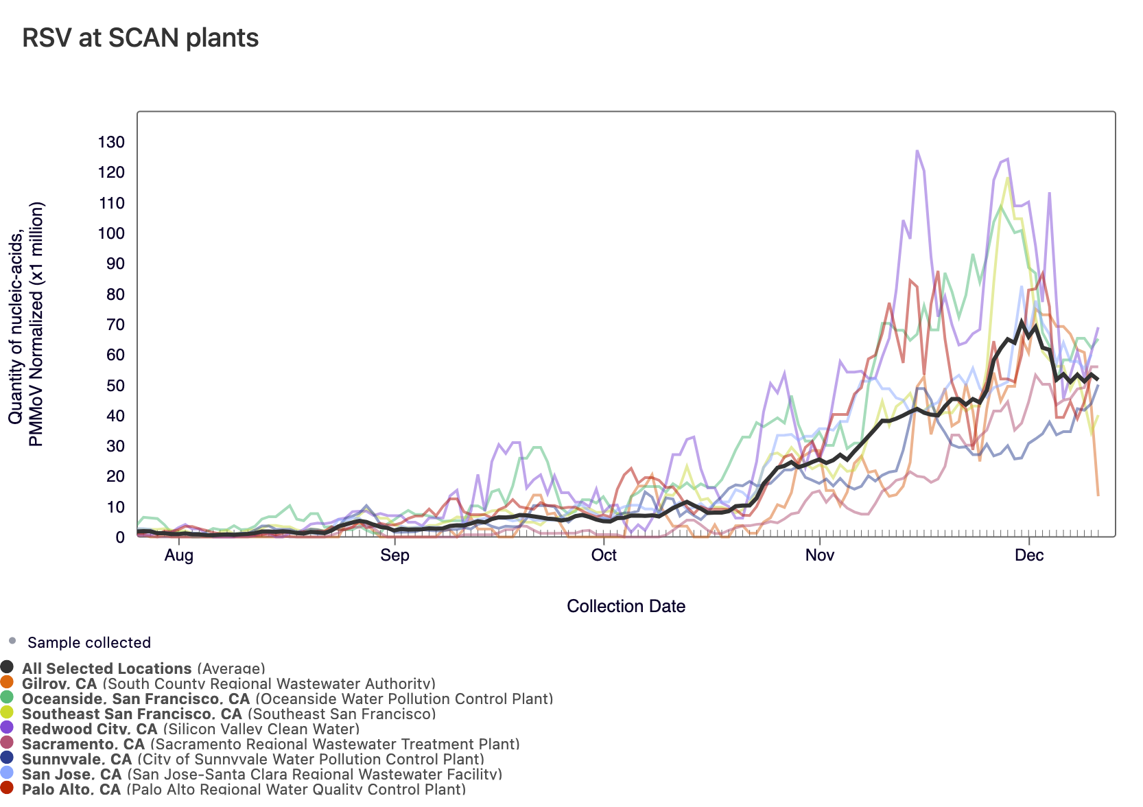 RSV RNA concentrations are high at most SCAN sites, and all SCAN sites have met the benchmark for wastewater onset. In the chart below, the population weighted average line across all the SCAN plants (black) is compared to the RSV concentrations at individual SCAN plants since August.