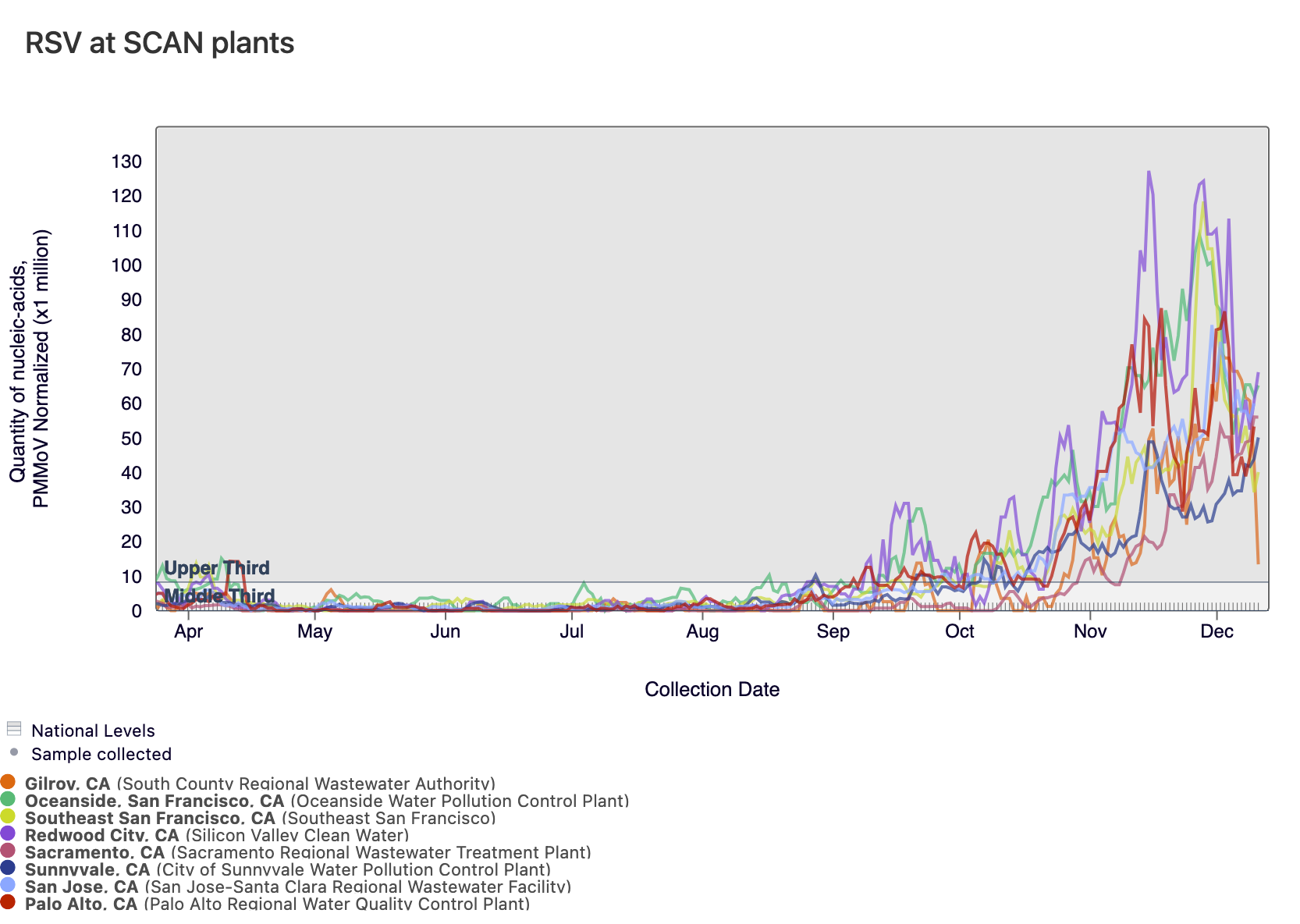 Below is a chart showing the National Levels benchmarks superimposed on the RSV data from the SCAN sites (you can access this chart here). Currently, all SCAN sites have RSV concentrations in the upper third level.
