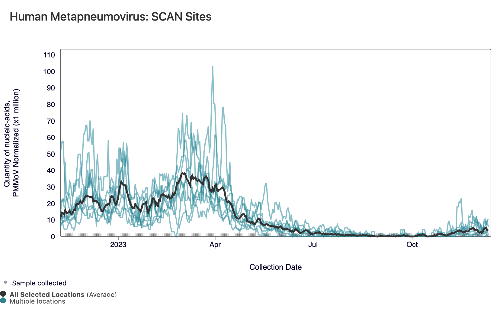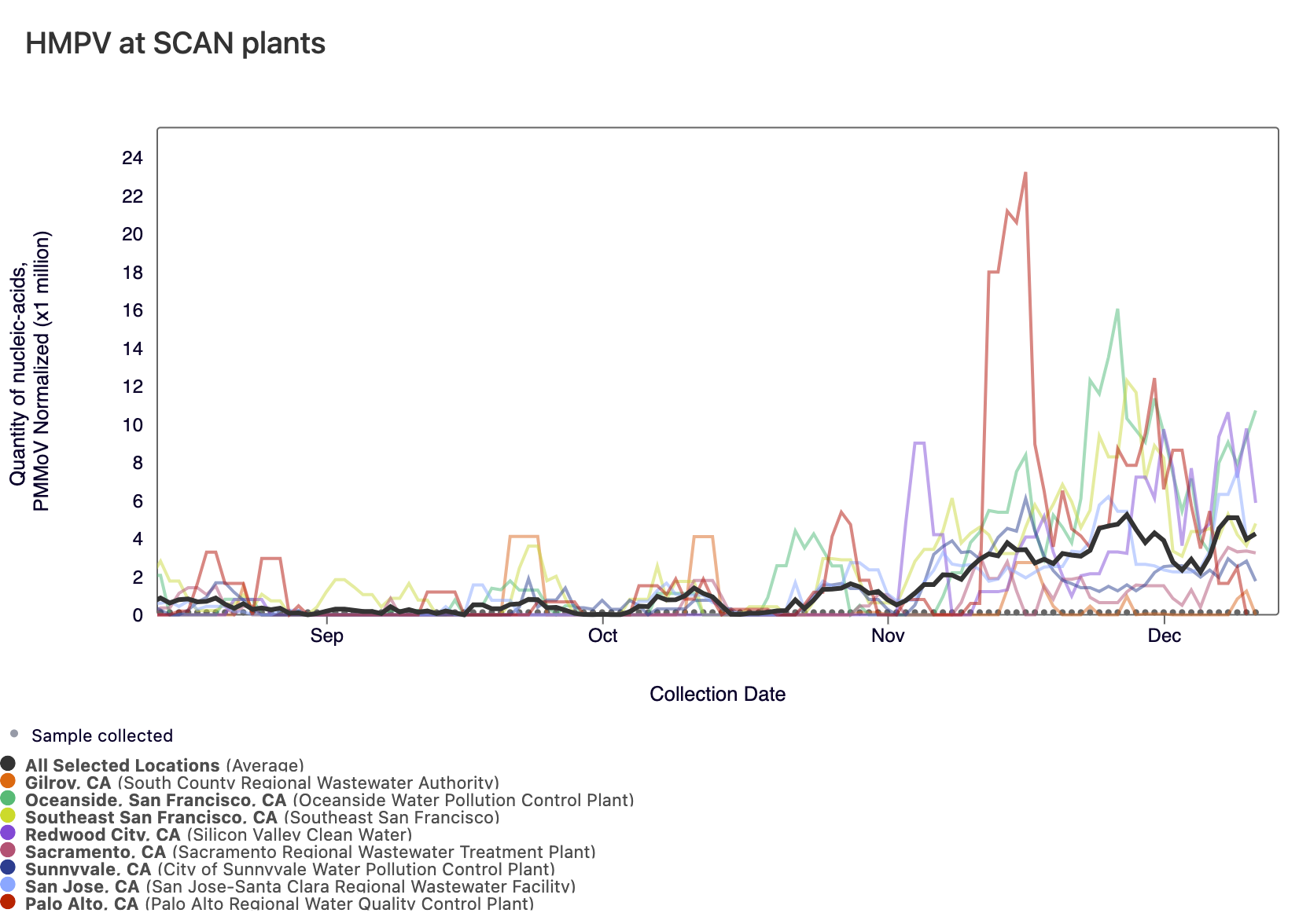 HMPV (Human metapneumovirus) RNA concentrations are low but increasing at most of plants in SCAN. However, no SCAN sites have met the benchmark for onset. In the chart below, the population weighted average line for all SCAN plants (black) is shown compared to the HMPV concentrations at individual SCAN sites since September.