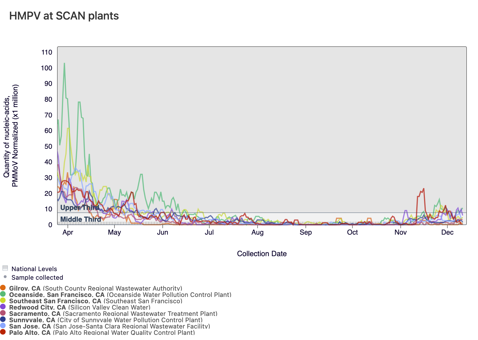 Below is a chart showing the National Levels benchmarks superimposed on the HMPV data from the SCAN sites. (You can access the chart here.) Currently, Oceanside SF has HMPV concentrations in the upper third level, and all other SCAN sites have HMPV concentrations in the middle third level.