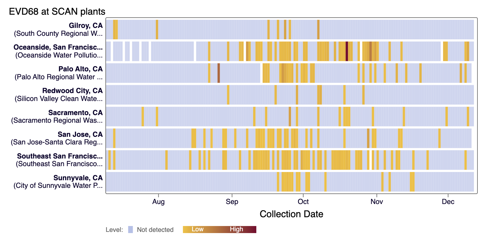 EV-D68 RNA was sporadically detected in samples collected in the last 21 days at all SCAN sites. The heat map below shows all the SCAN sites as a row, and each date as a column since monitoring began in July. The color blue means the sample was non-detect for EV-D68 RNA and the colors get darker with higher concentrations. White indicates no sample was collected. You can access the chart here. EV-D68 is believed to occur biennially, and we saw it last year, so perhaps it will not be common this year.