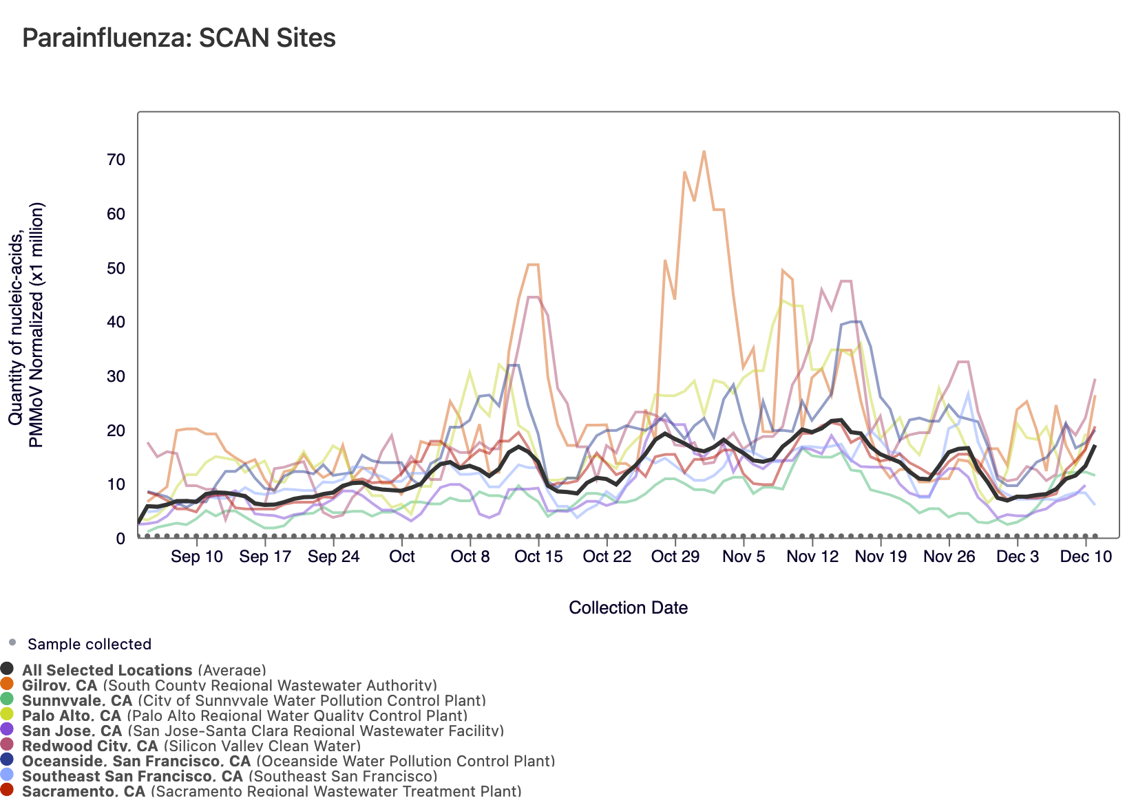 Parainfluenza RNA has been detected in most samples collected from SCAN sites. The population weighted average across SCAN sites is shown in black. You can access the chart here.