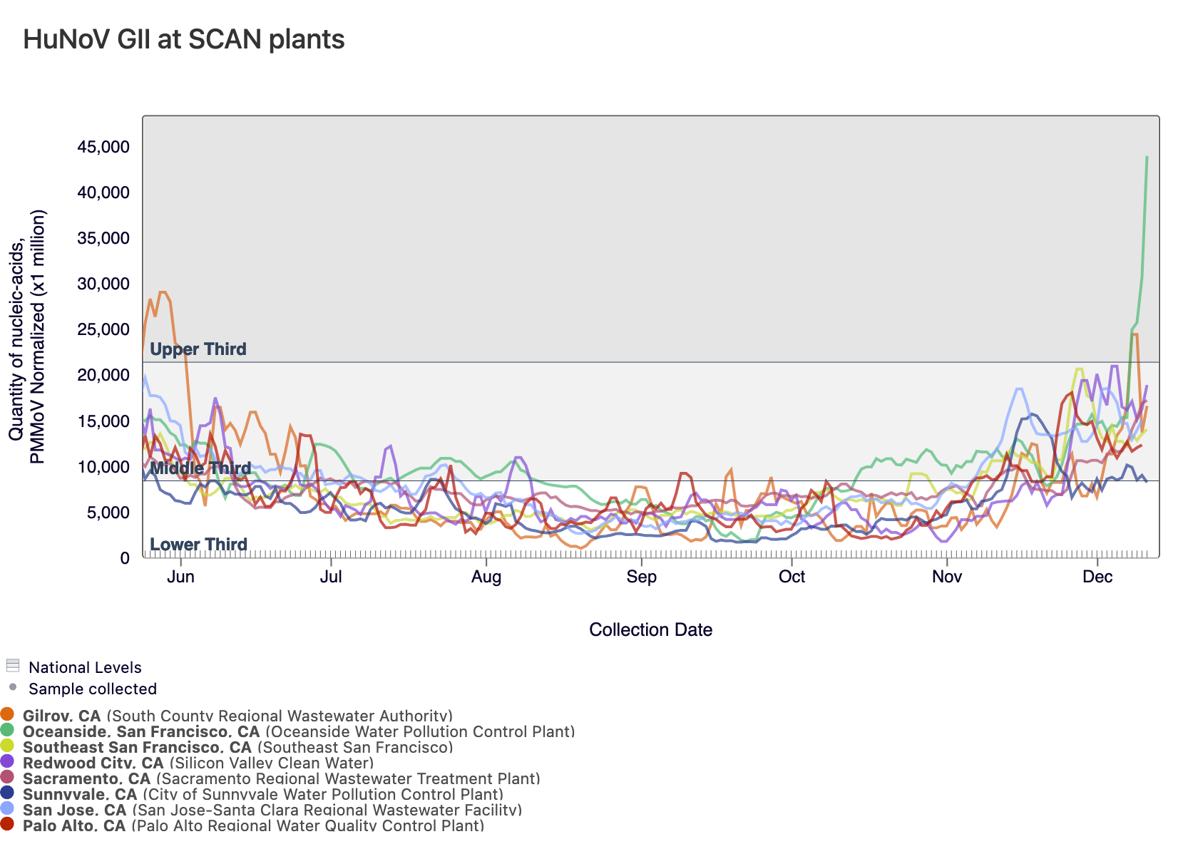 Below is a chart showing the National Levels benchmarks superimposed on the Norovirus concentrations from the SCAN sites. (You can access the chart here.) Currently, Gilroy and Oceanside SF are in the upper third tier and all other SCAN sites have Norovirus concentrations in the middle third tier.