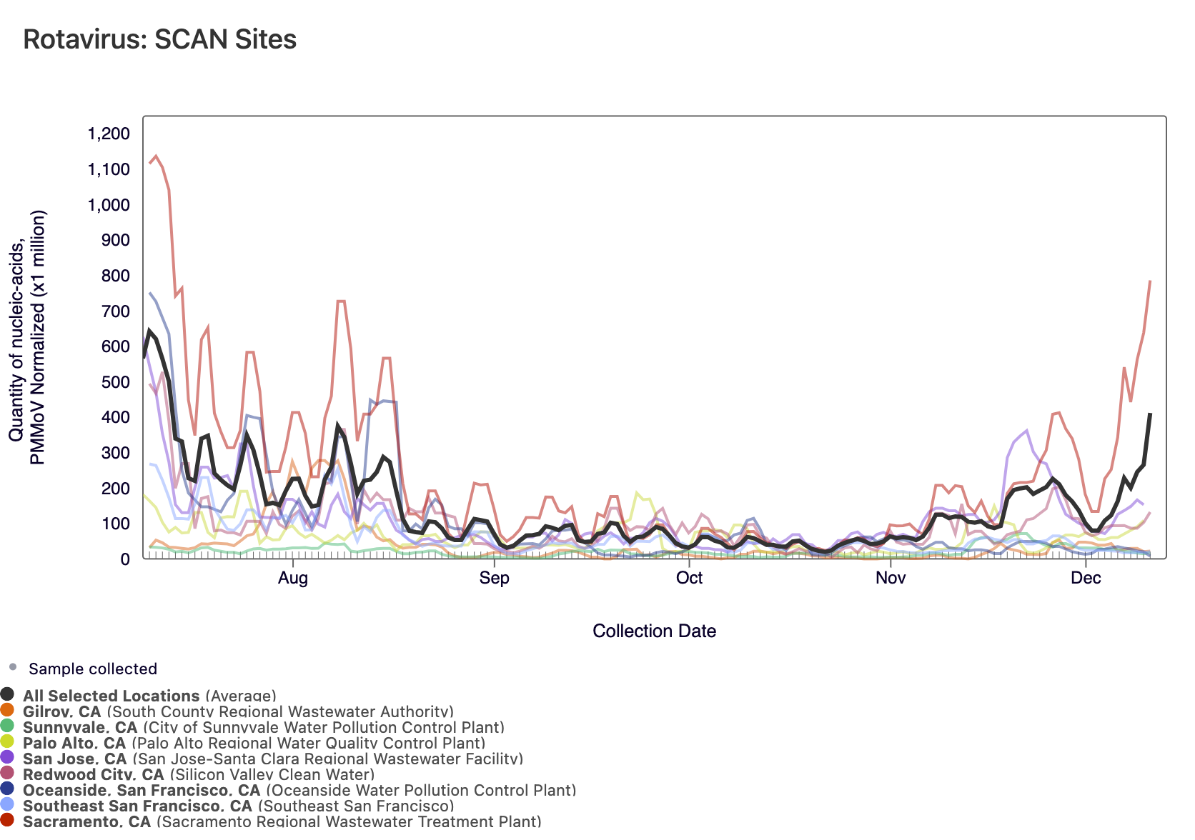 Rotavirus RNA concentrations are shown in the chart below; all the SCAN plants are shown together. The population weighted average line is shown in black. You can interact with the chart of all the plants here.