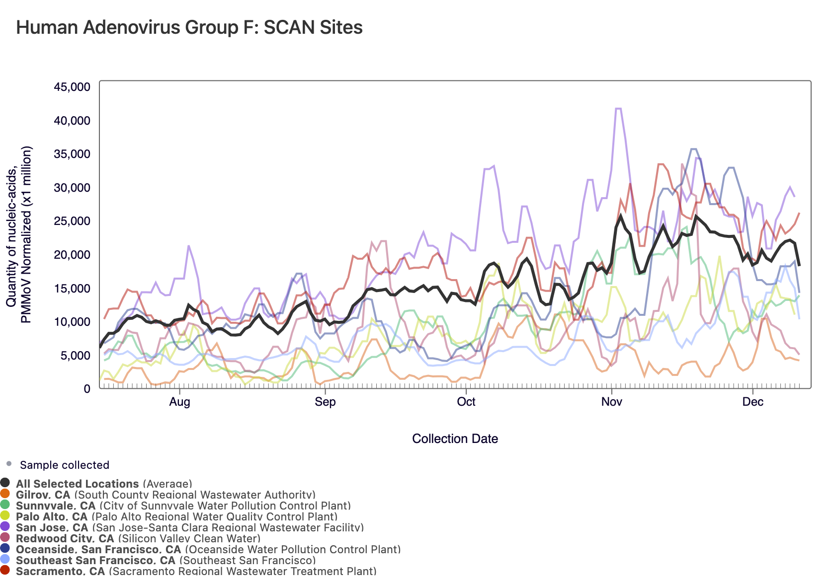 Human Adenovirus Group F DNA concentrations are shown in the chart below; all the SCAN plants are shown together. The population weighted average line is shown in black. You can interact with the chart of all the plants here.