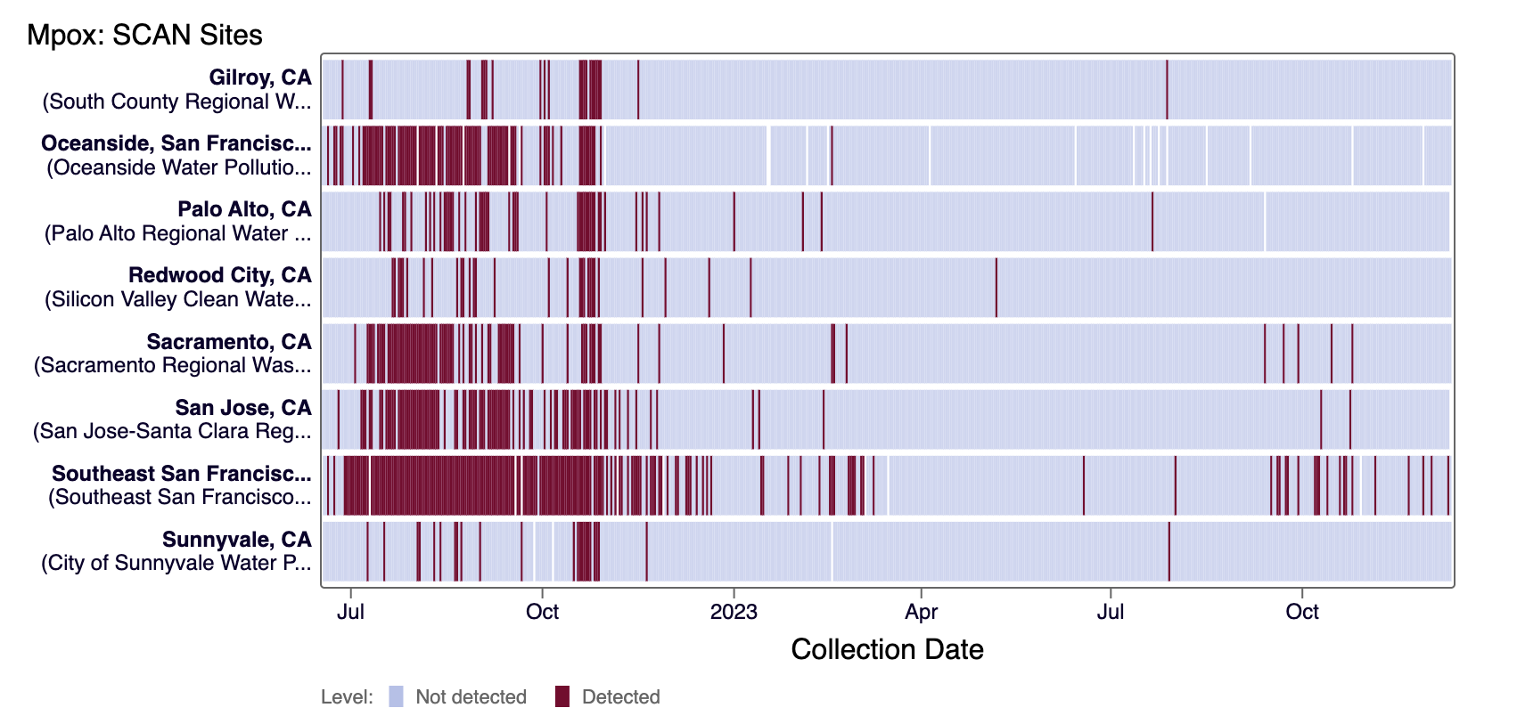Mpox DNA was not detected in most samples collected in the last 21 days at all SCAN sites. The heat map below shows all the SCAN sites as a row, and each date as a column since July 2022. The color blue means that MPXV DNA was not detected in the sample, and the dark purple color means it was detected. White indicates no sample was collected. The chart shows all the data we have collected. You can access the chart here.
