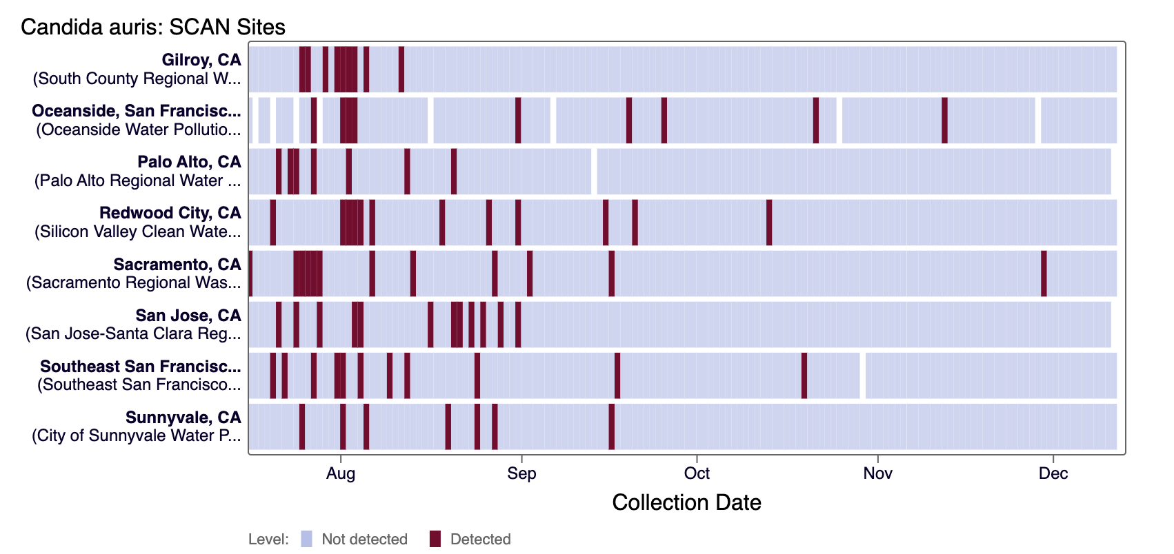 Candida auris DNA was not detected in most samples collected in the last 21 days at all SCAN sites. The heat map below shows all the SCAN sites as a row, and each date as a column for all data collected since monitoring began in July. The color blue means that Candida auris DNA was not detected in the sample, and the dark purple color means it was detected. White indicates no sample was collected. You can access the chart here.