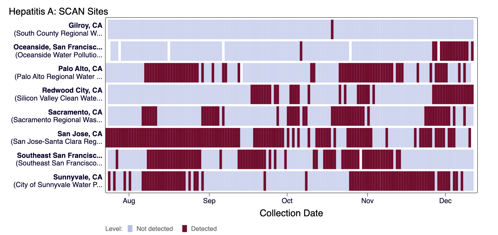 Hepatitis A RNA was detected in most samples from most SCAN sites in the last 21 days. Hepatitis A RNA was not detected at Gilroy and Southeast SF and was detected sporadically at Palo Alto in the last 21 days. The heat map below shows all the SCAN sites as a row, and each date as a column for all data collected since monitoring began in July. The color blue means that Hepatitis A RNA was not detected in the sample, and the dark purple color means it was detected. White indicates no sample was collected. You can access the chart here.