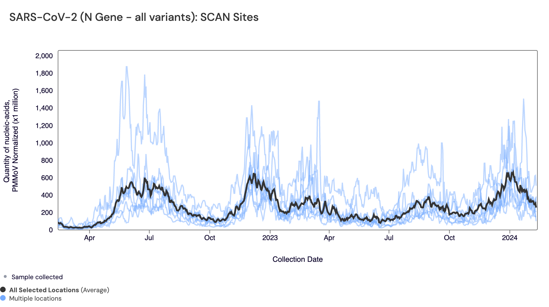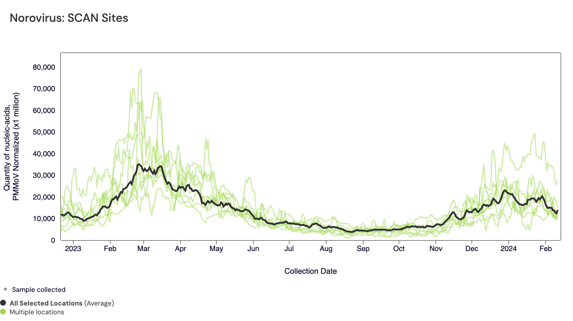 The plot below shows the Norovirus concentrations at the SCAN sites since we began monitoring in late 2022. The population weighted average line is shown in black. You can interact with the chart of all the plants at this link.