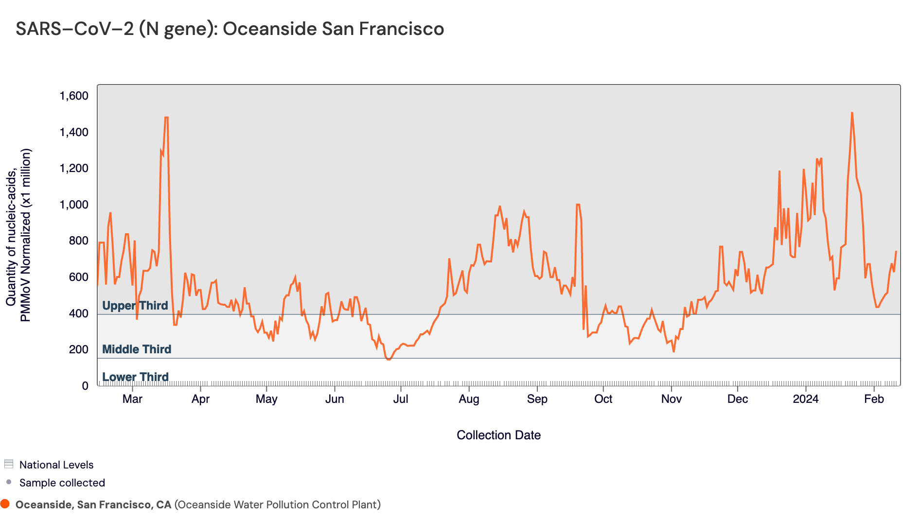 SARS-CoV-2 N gene concentrations are between 100,000 and 1,000,000 copies/g. In the chart below, the National Levels benchmarks are superimposed on the the SARS-CoV-2 concentrations at Oceanside SF from the last 12 months.