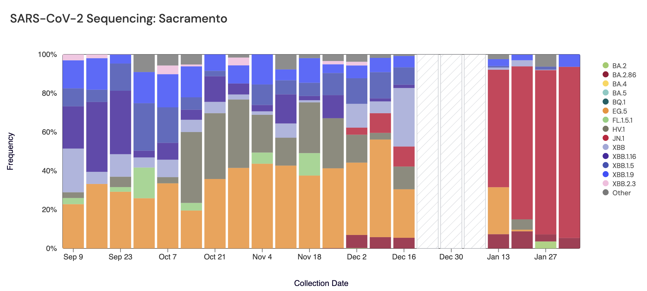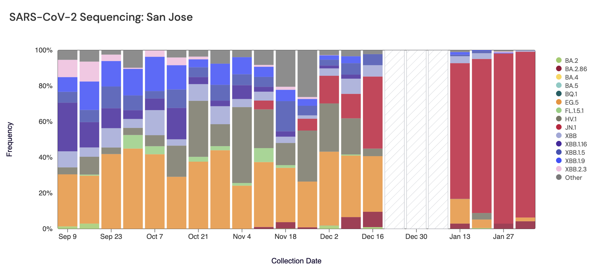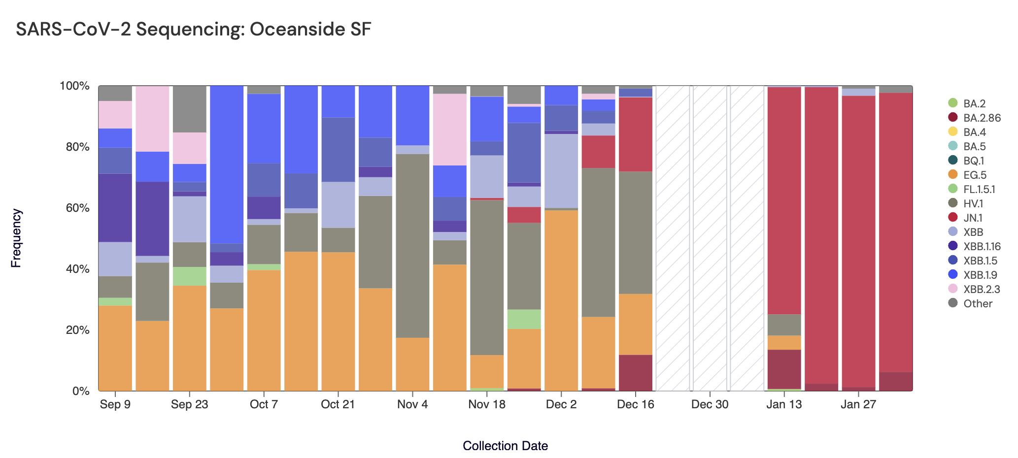 Below are plots from Oceanside SF, Sacramento, and San Jose showing the relative proportions of different variants inferred from sequencing the entire genome of SARS-CoV-2. White and grey striped bars indicate no data is currently available for that date. In the most recent samples, JN.1 (bright red) made up the largest proportion of the lineages detected at Oceanside SF (91.4%), San Jose (92.8%), and Sacramento (88.2%). Note that the sequencing data are always from samples taken between 1-2 weeks ago (in this case, 3 February 2024).