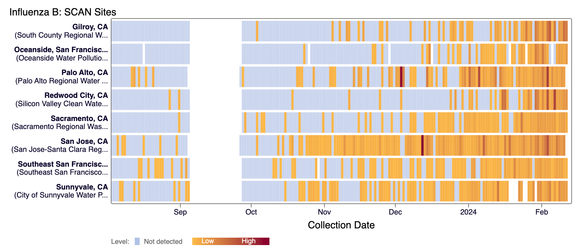 Influenza B (IBV) RNA has been detected in a majority of SCAN sites in the last 21 days. The heat map below shows all the SCAN sites as a row and each date as a column for the last year. The color blue means the sample was non-detect for IBV RNA and the colors get darker with higher concentrations. White indicates no sample was collected. We briefly stopped monitoring for IBV, which explains gap in data across sites in September. Here is the link to the heat map chart.