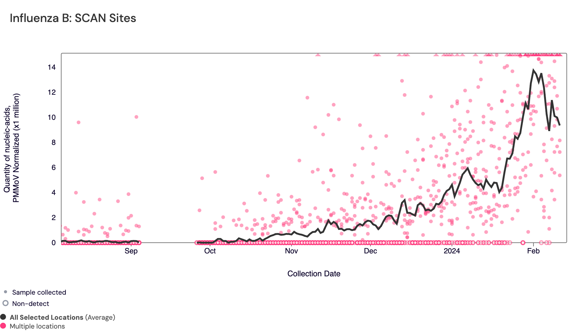 Influenza A (IAV) RNA: Over a month ago, we identified a technical issue with the fluorescent molecule on the influenza A assay probe that impacted the performance of our influenza A digital RT-PCR assay. All of the impacted data (1 Oct 2023 to approximately 11 Jan 2024) were removed from the website, and we reanalyzed 2 samples per week from the impacted period. The new, reanalyzed data are live on the website now.