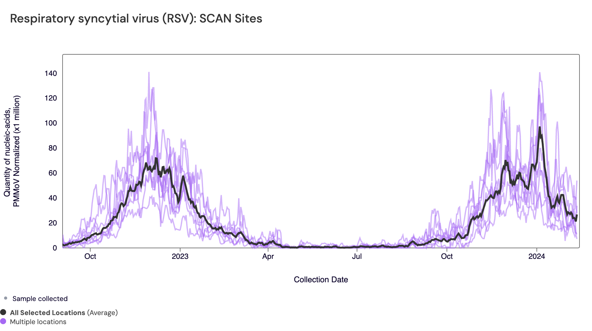 In the chart below, the population weighted average line across all the SCAN sites is shown in black, and you can see the current concentrations relative to the peak RSV levels from last year. The link to the chart below is here if you would like to interact with it.