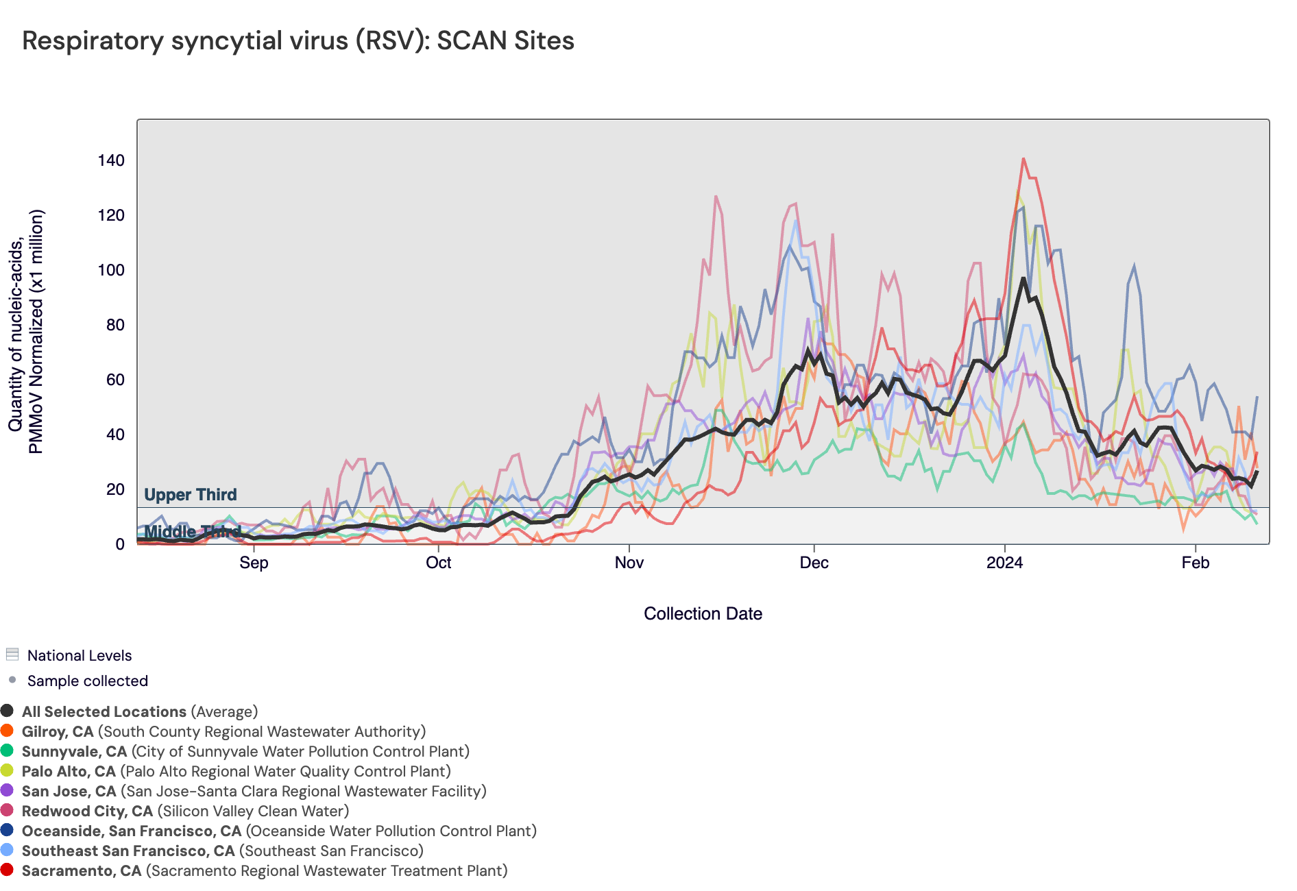 RSV RNA concentrations remain high at most SCAN sites and all SCAN sites remain in wastewater onset. In the chart below, the population weighted average line across all the SCAN plants (black) is compared to the RSV concentrations at individual SCAN plants over the last six months. The National Levels benchmarks superimposed on the RSV data from the SCAN sites (you can access this chart here). Currently, most SCAN sites have RSV concentrations in the upper third level.