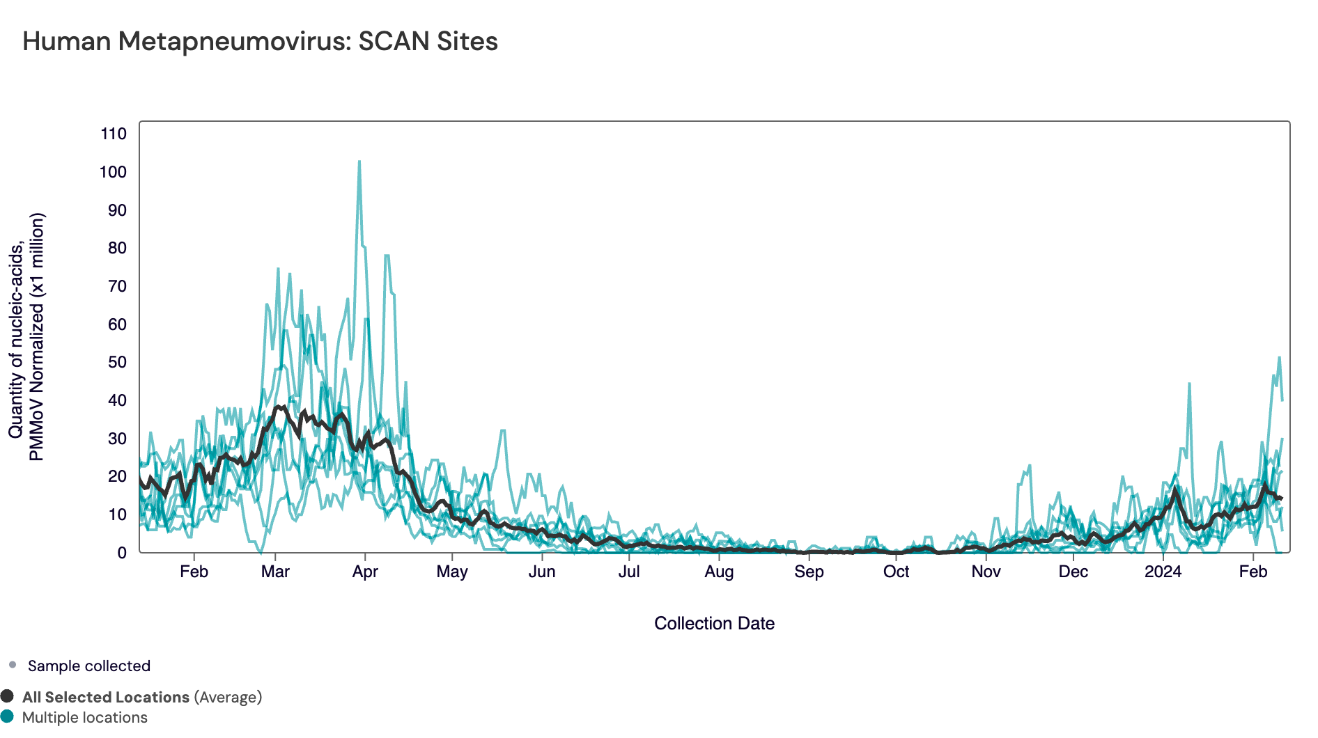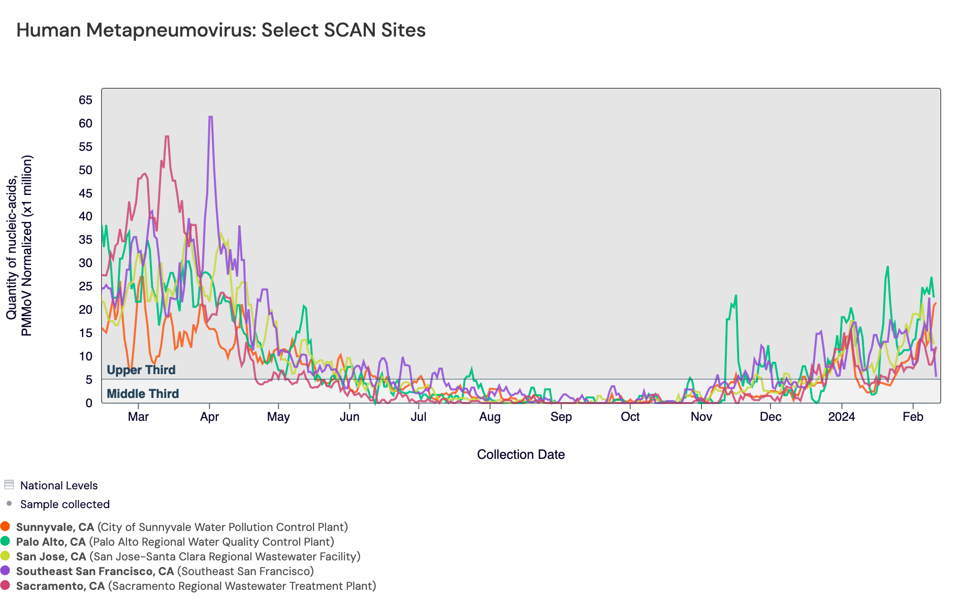 HMPV (Human metapneumovirus) RNA concentrations are increasing at many SCAN sites. In the chart below, the National Levels benchmarks are superimposed on the the HMPV concentrations at Palo Alto, Sacramento, San Jose, Southeast SF and Sunnyvale over the last 12 months.