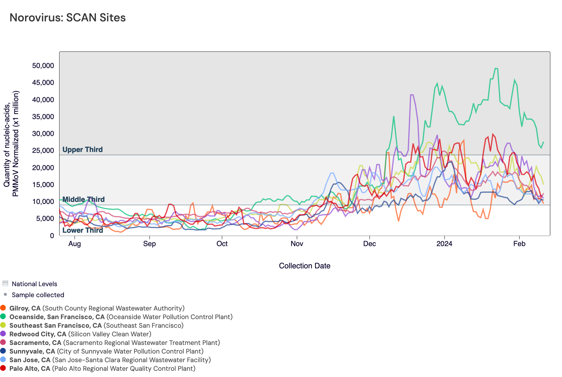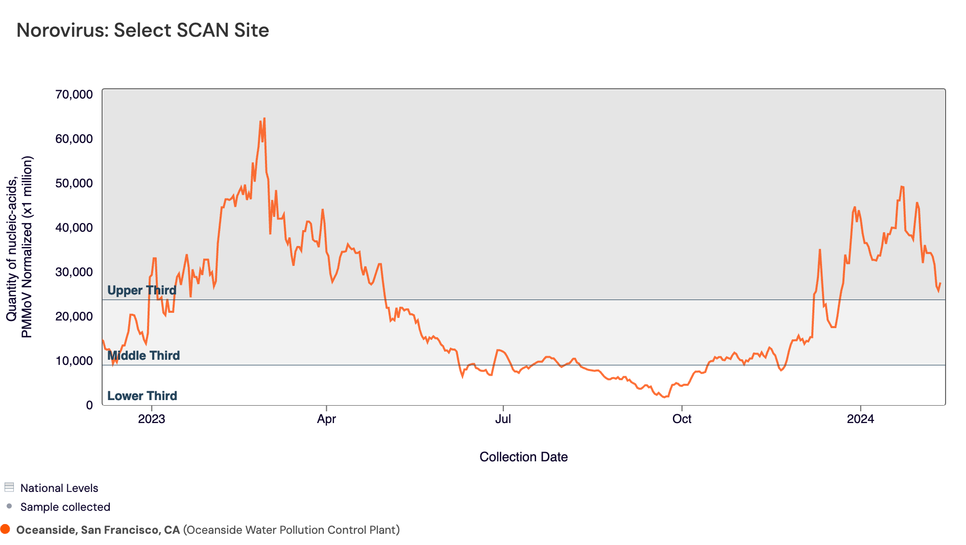 Below is a chart showing the National Levels benchmarks superimposed on the Norovirus concentrations from the SCAN sites since August 2023 (You can access the chart here.) Currently, Oceanside SF (green line in the plot below) is in the upper third tier and all other SCAN sites have Norovirus concentrations in the middle third tier.