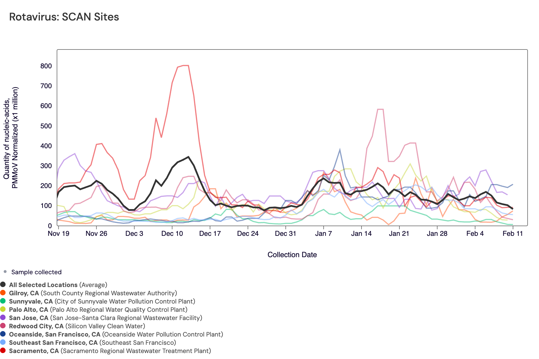Rotavirus RNA concentrations are shown in the chart below (all the SCAN plants are shown together). The population weighted average line is shown in black. You can interact with the chart of all the plants here.
