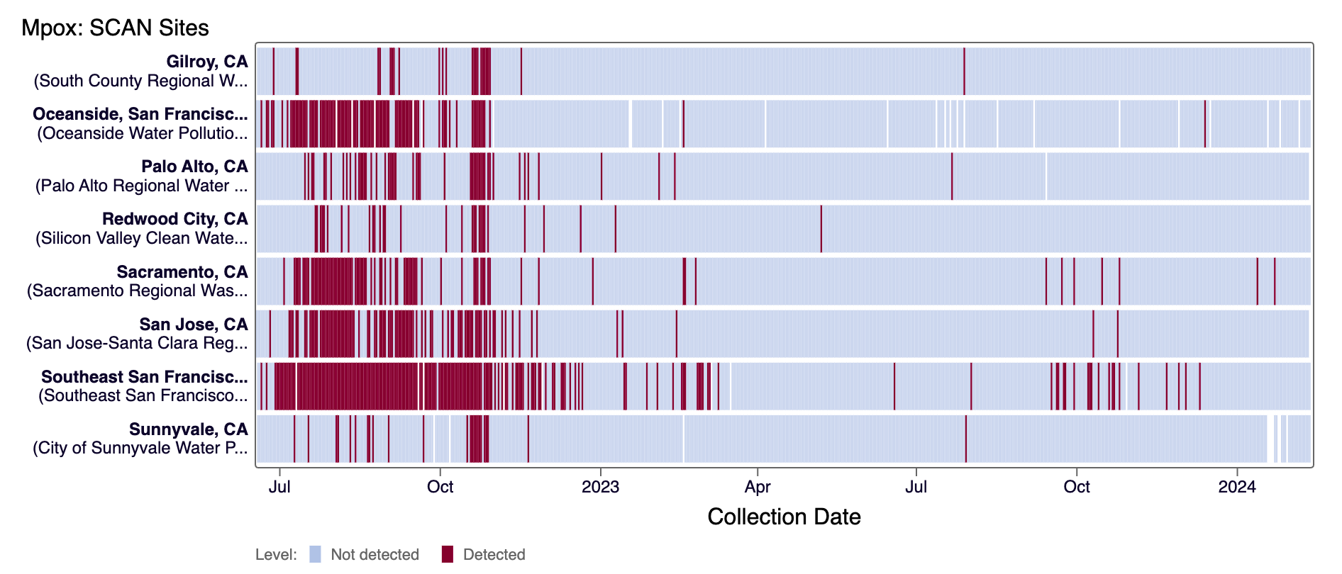 The heat map below shows all the SCAN sites as a row, and each date as a column since July 2022. The color blue means that MPXV DNA was not detected in the sample, and the dark purple color means it was detected. White indicates no sample was collected. The chart shows all the data we have collected. You can access the chart here.