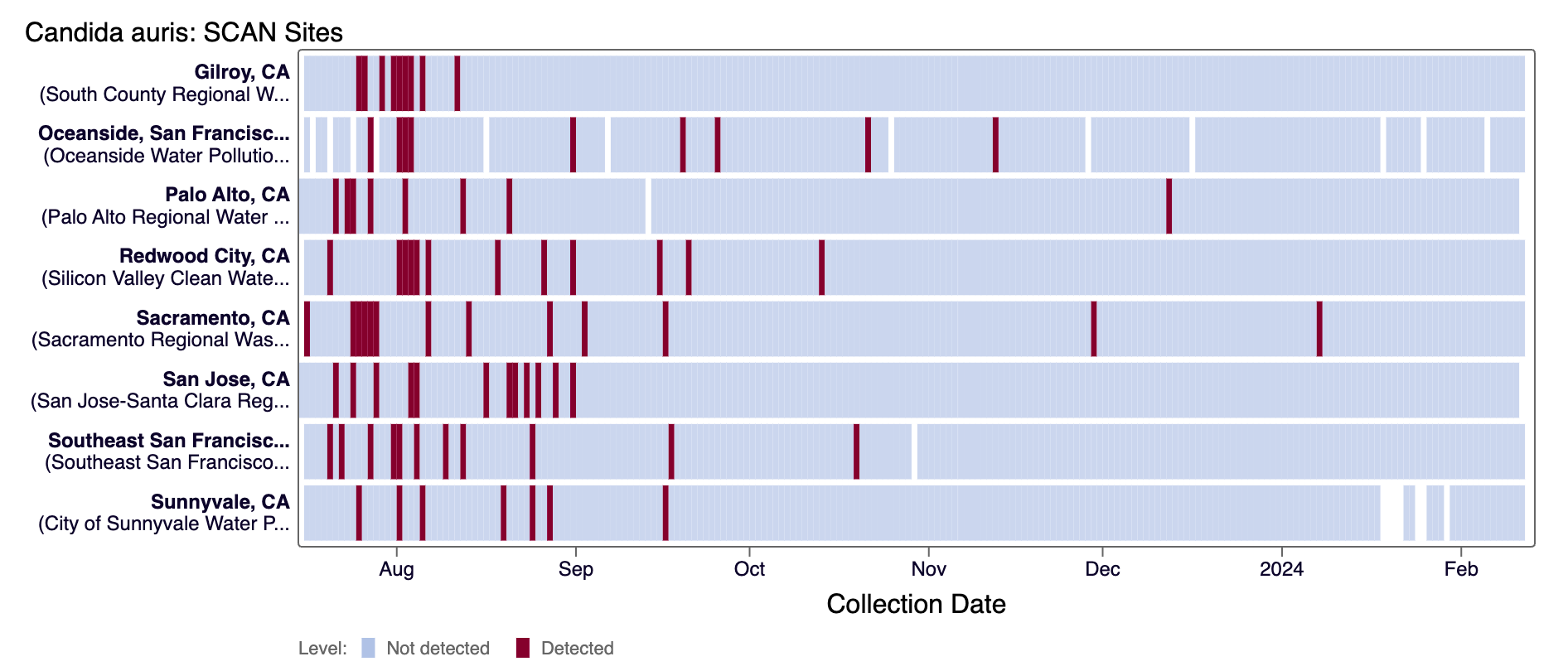 Candida auris DNA was not detected in the last 21 days at all SCAN sites. The heat map below shows all the SCAN sites as a row, and each date as a column for all data collected since monitoring began in July. The color blue means that Candida auris DNA was not detected in the sample, and the dark purple color means it was detected. White indicates no sample was collected. You can access the chart here.