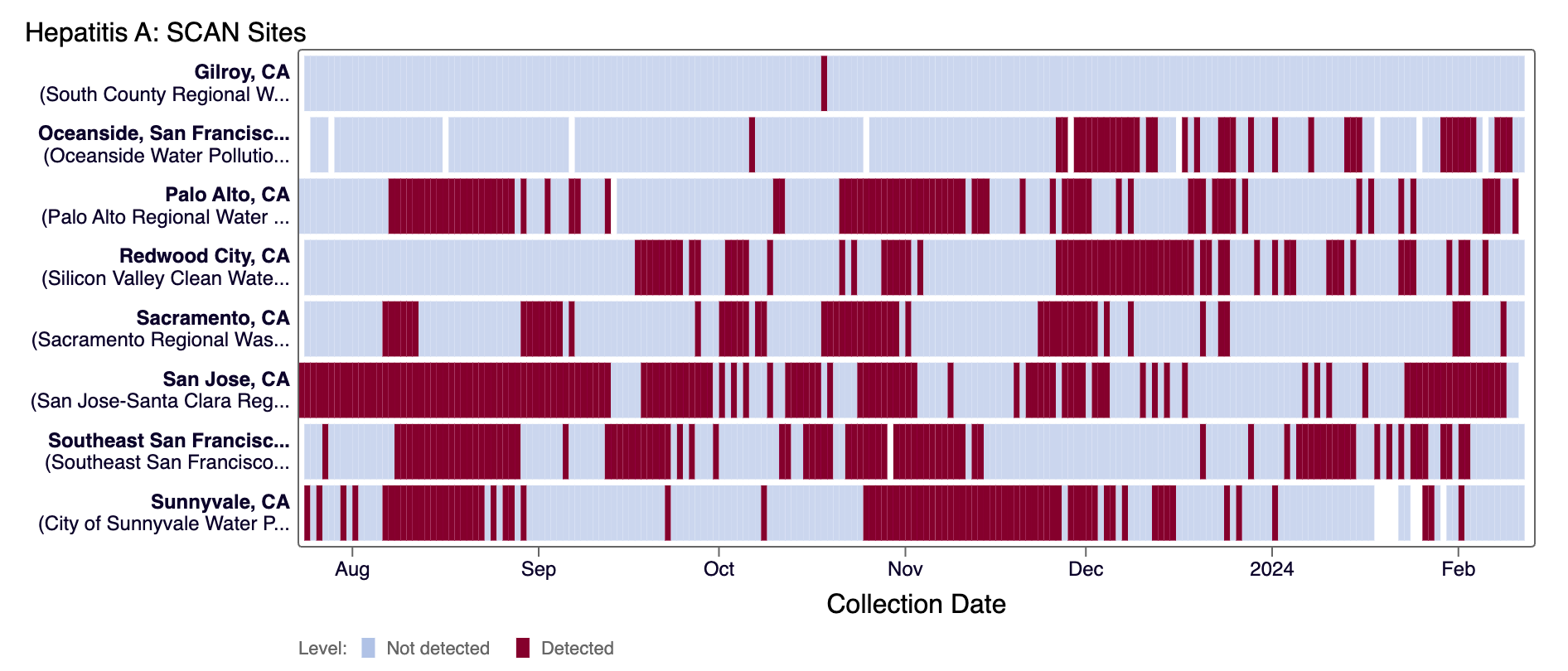 Hepatitis A RNA was detected sporadically at most SCAN sites in the last 21 days (except for Gilroy). The heat map below shows all the SCAN sites as a row, and each date as a column for all data collected since monitoring began in July. The color blue means that Hepatitis A RNA was not detected in the sample, and the dark purple color means it was detected. White indicates no sample was collected. You can access the chart here.