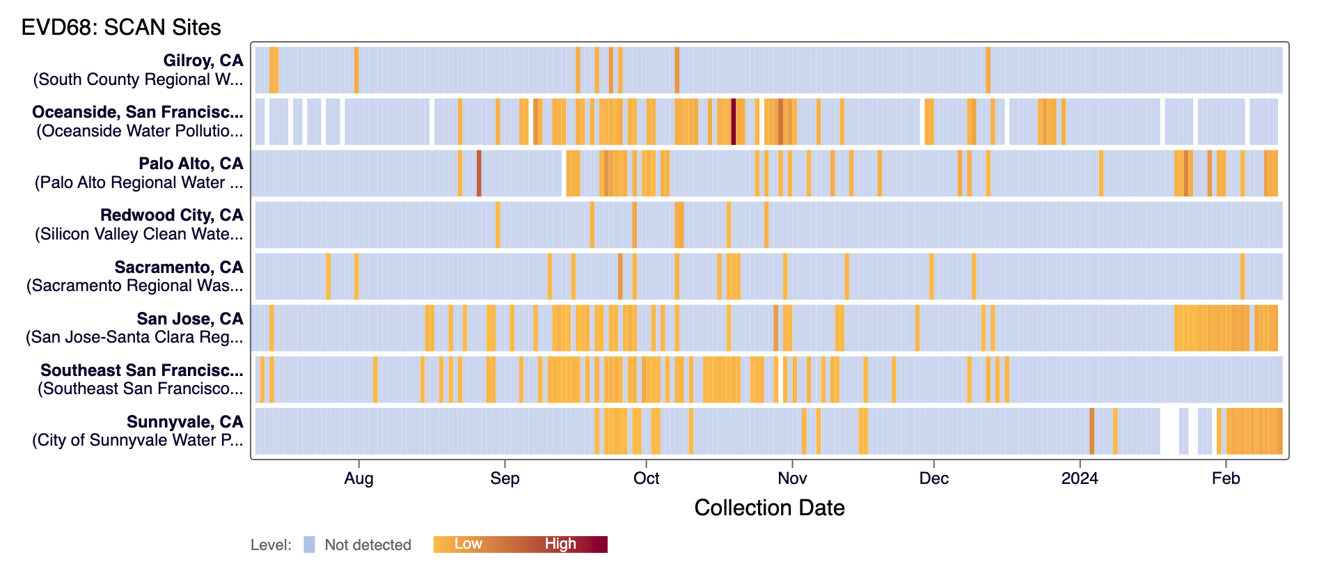 EV-D68 RNA was frequently detected at Palo Alto, San Jose and Sunnyvale in samples collected in the last 21 days. The heat map below shows all the SCAN sites as a row, and each date as a column since monitoring began in July 2023. The color blue means the sample was non-detect for EV-D68 RNA and the colors get darker with higher concentrations. White indicates no sample was collected. You can access the chart here.