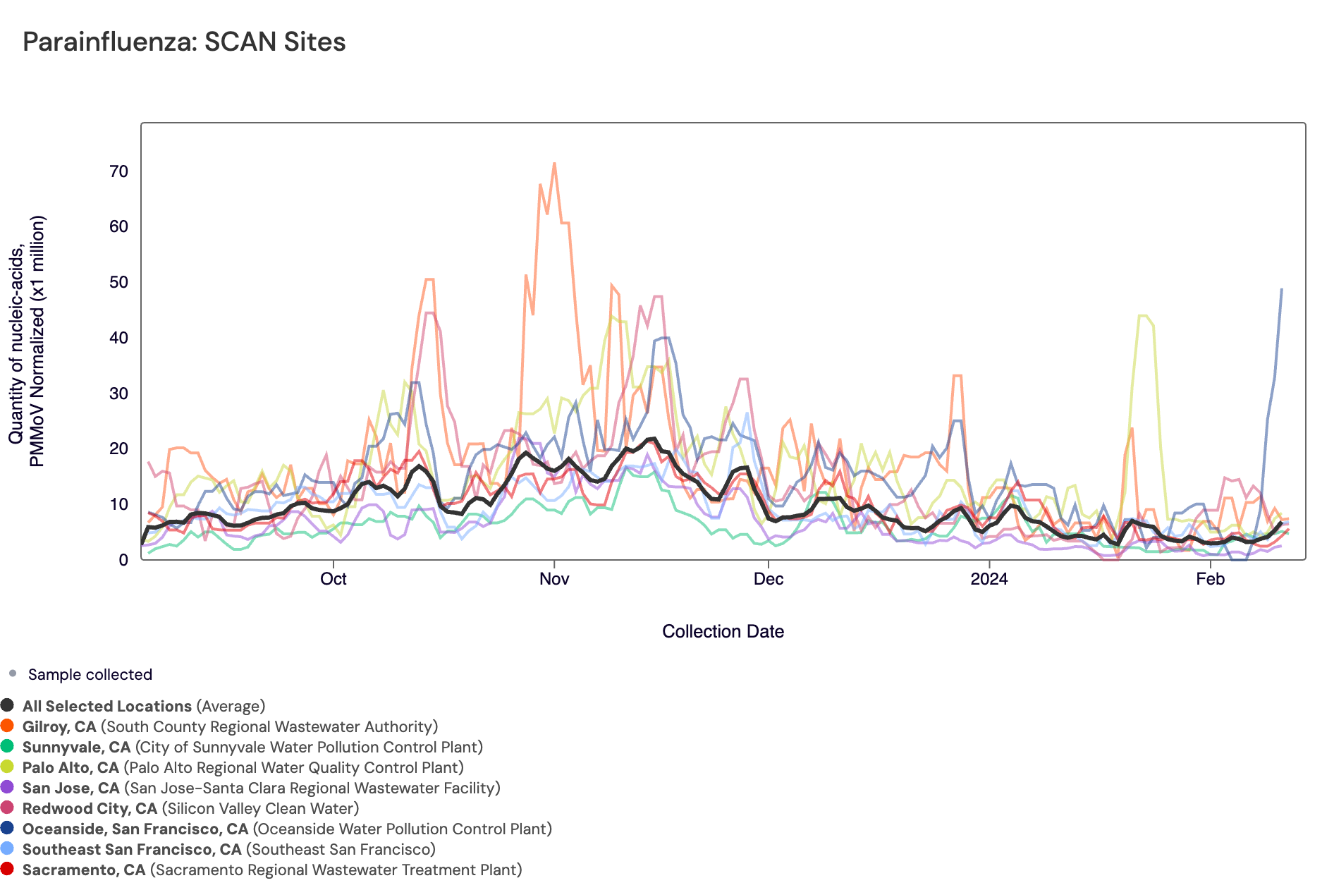 Parainfluenza RNA has consistently been detected in most samples collected from SCAN sites. The population weighted average across SCAN sites is shown in black. You can access the chart here.