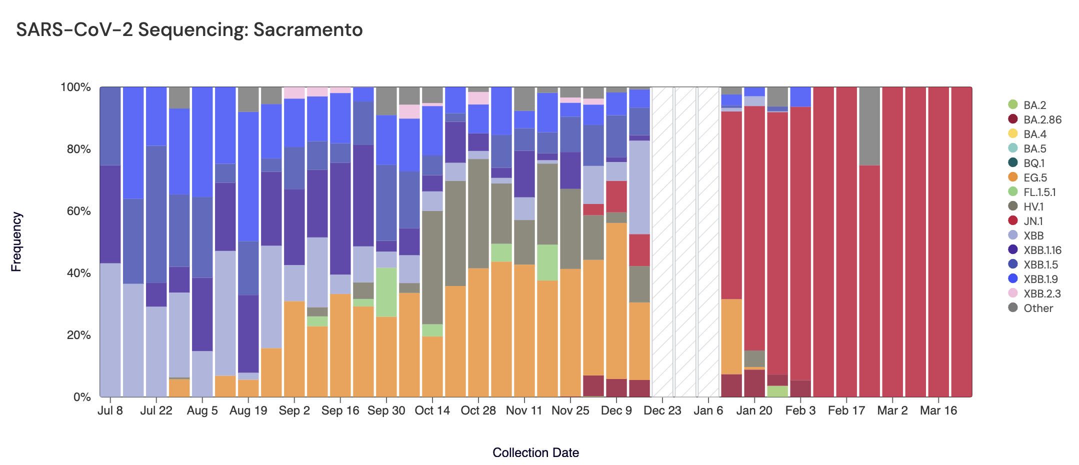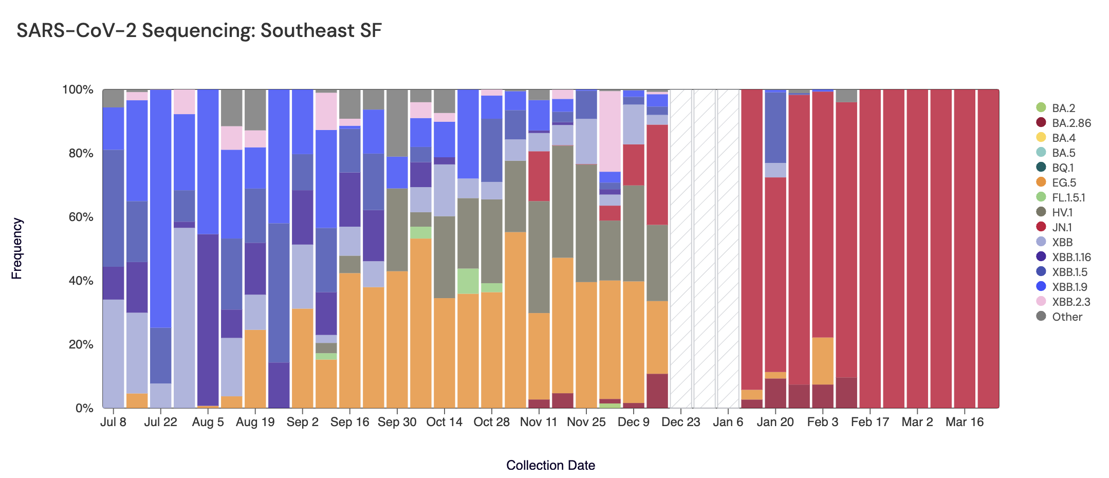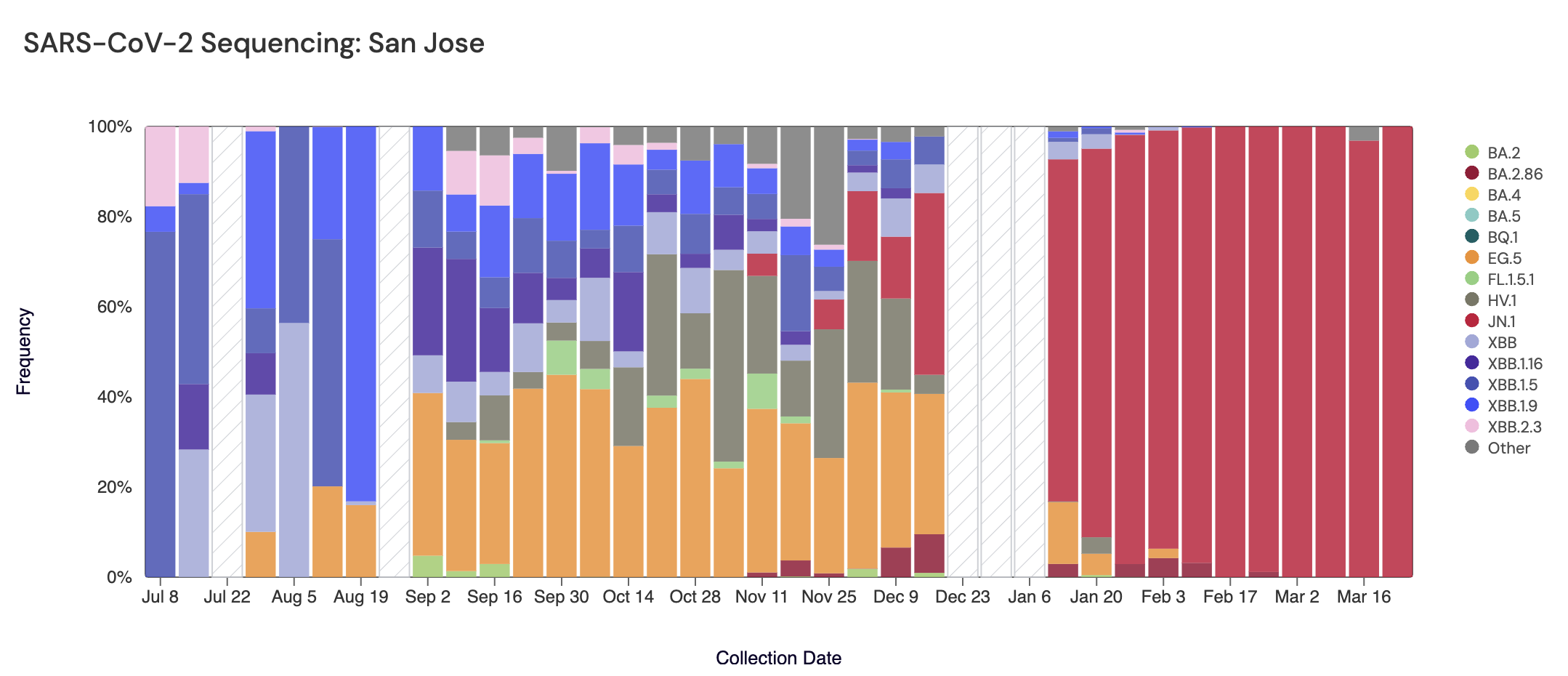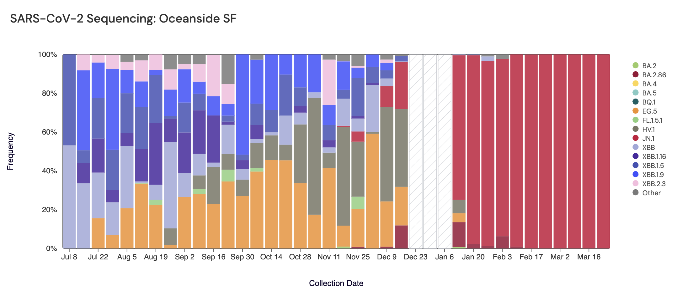 Below are plots from Oceanside SF, Sacramento, San Jose, and Southeast SF showing the relative proportions of different variants inferred from sequencing the entire genome of SARS-CoV-2. White and grey striped bars indicate no data is currently available for that week. In the most recent samples, JN.1 (bright red) made up the largest proportion of the lineages detected at Oceanside SF (100%), Sacramento (100%), San Jose (100%), and Southeast SF (100%). Note that the sequencing data are always from samples taken between 1-2 weeks ago (in this case, March 23, 2024).