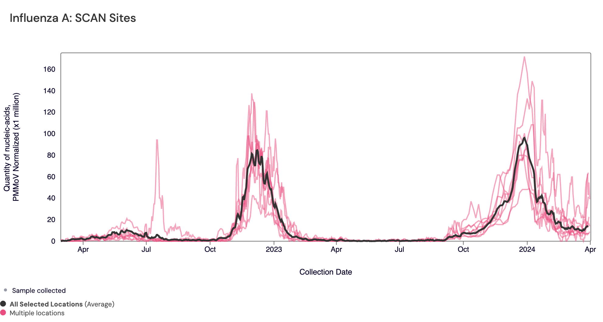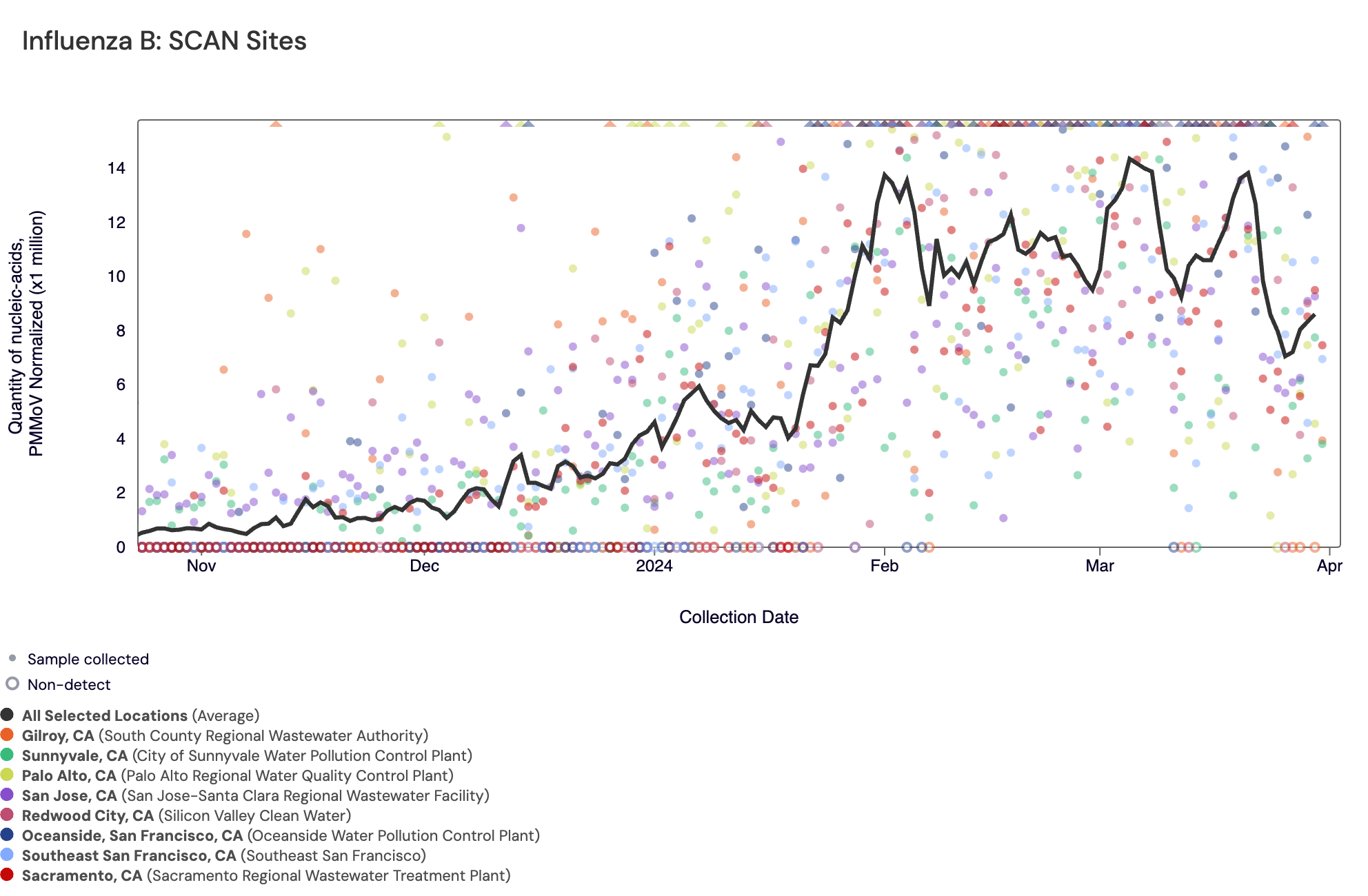 Influenza A (IAV) RNA: Below are all the IAV data from all the SCAN plants for the last two years. You can access the graph here. The population weighted average across the SCAN plants is shown in black. All SCAN sites are still in onset for IAV but have come down from the peak seen at the end of 2023/beginning of 2024.