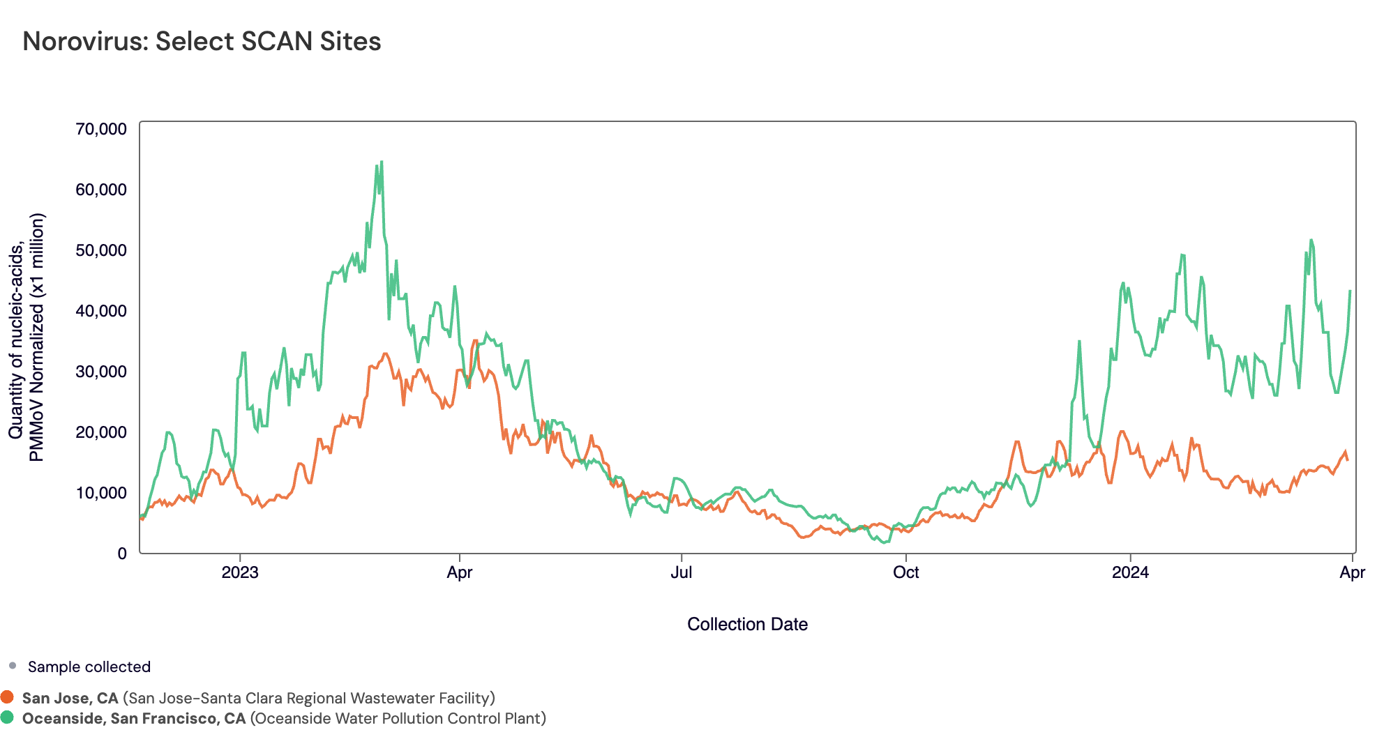 Norovirus GII RNA was commonly detected at all SCAN sites, which is what we are observing across the national WWSCAN sites as well. Below is a plot with Oceanside SF (in green) and San Jose (in red) showing increasing levels being measured in daily samples.