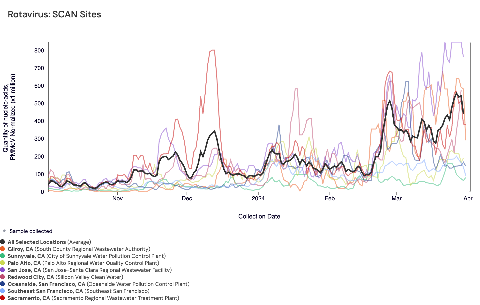 Rotavirus RNA concentrations are shown in the chart below (all the SCAN plants are shown together) over the last six months. The population weighted average line is shown in black. You can interact with the chart of all the plants here.