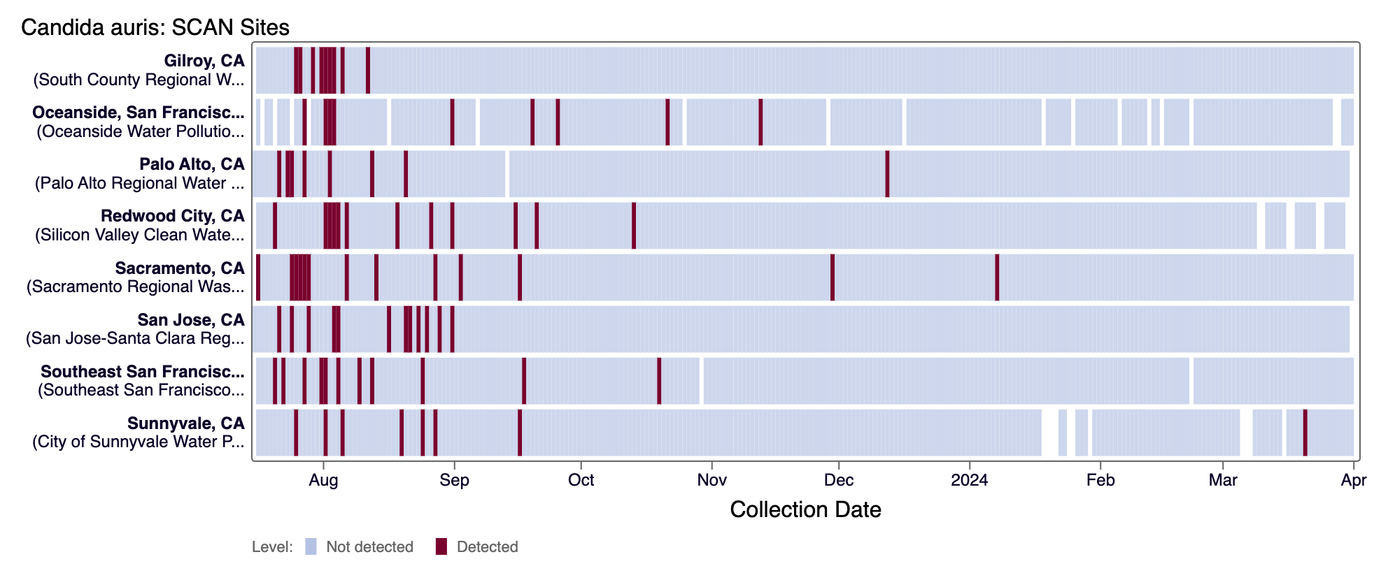 Candida auris DNA was not detected in the last 21 days at most SCAN sites (1 positive detection from Sunnyvale on 3/20/24). Currently all SCAN sites are in the 'LOW' category for C. auris.