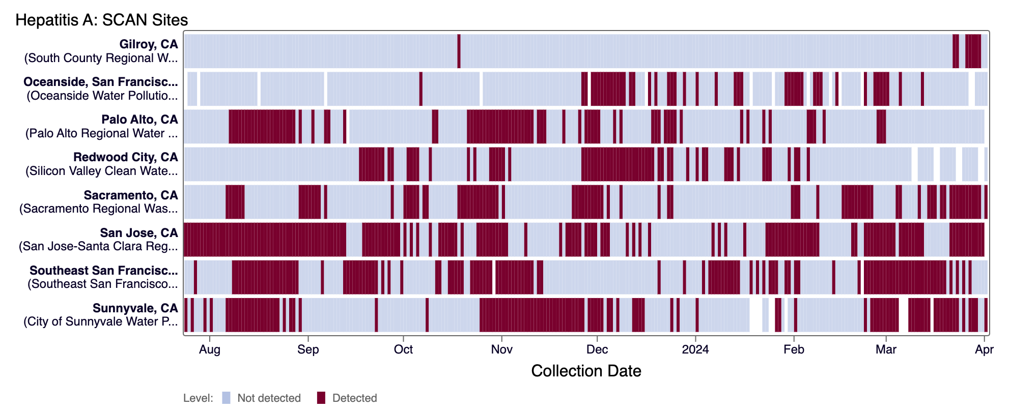 The heat map below shows all the SCAN sites as a row, and each date as a column for all data collected since monitoring began in July 2023. The color blue means that Hepatitis A RNA was not detected in the sample, and the dark purple color means it was detected. White indicates no sample was collected. You can access the chart here.