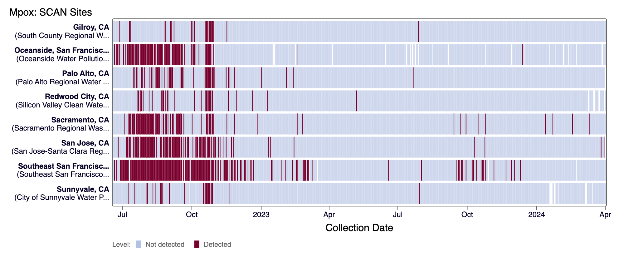 Mpox DNA was not detected in the last 21 days at most SCAN sites (2 positive detection from San Jose on 3/26/24 and 3/30/24). Currently all SCAN sites are in the 'LOW' category for Mpox.