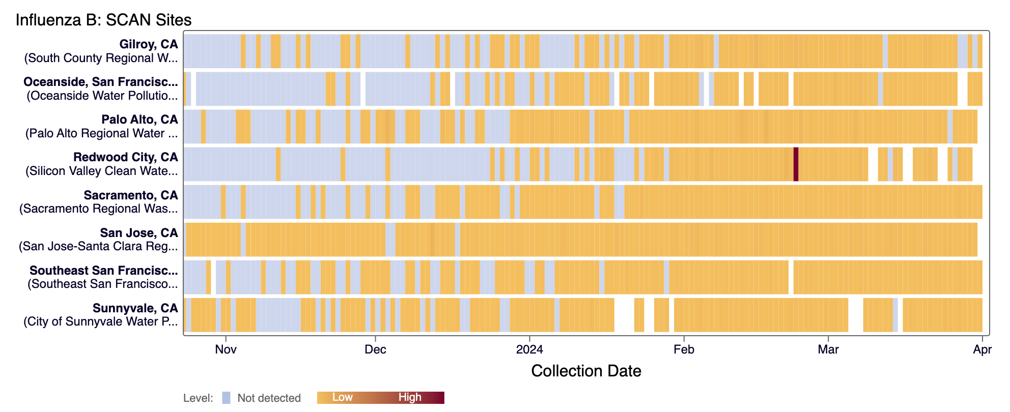 - Gilroy, Palo Alto, Sacramento, San Jose, Southeast SF, SVCW, and Sunnyvale are in the LOW Wastewater Category for Parainfluenza