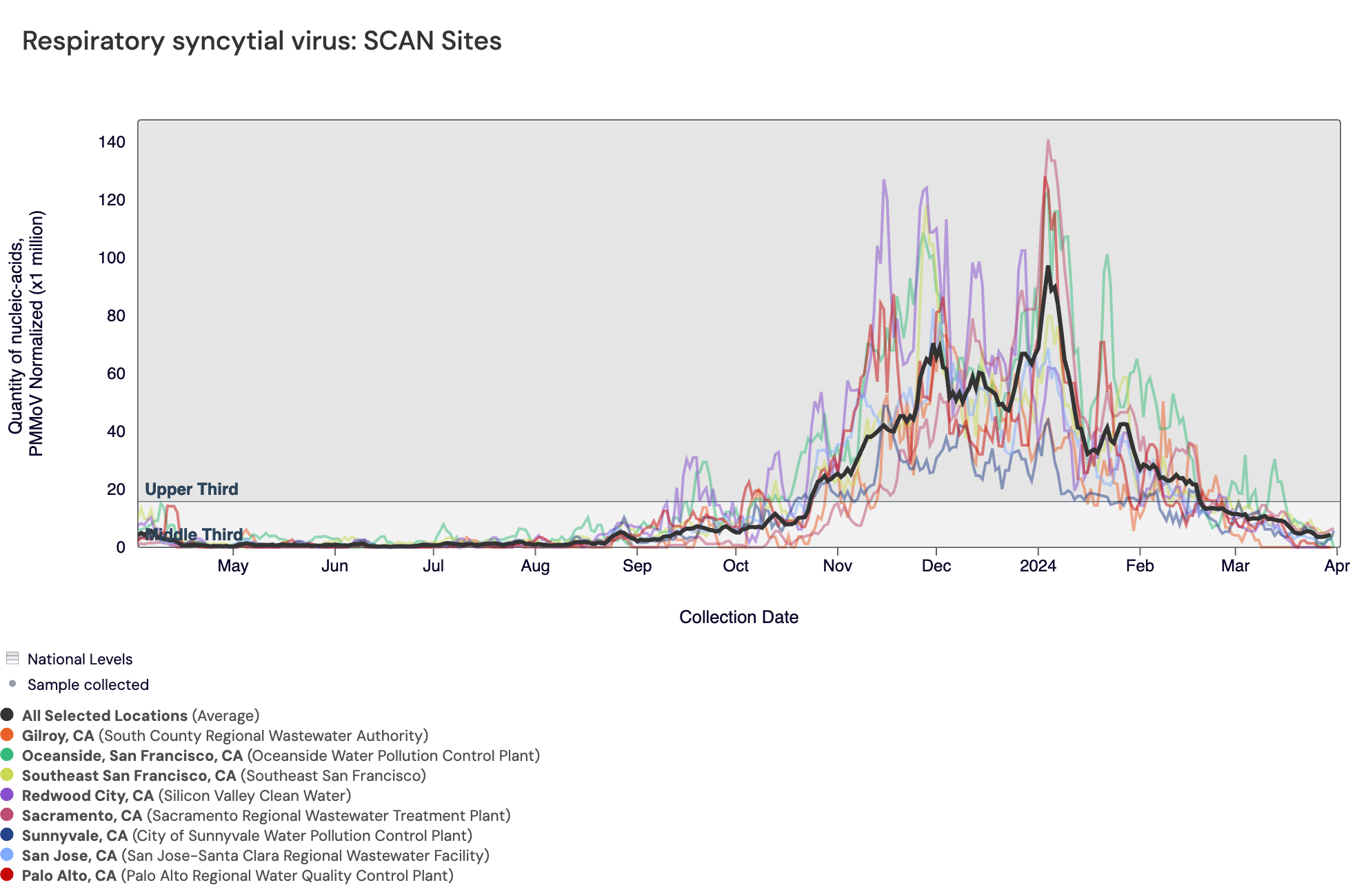 RSV RNA concentrations remain elevated at most SCAN sites but are coming down from levels we saw in late 2023/early 2024. In the chart below, the population weighted average line across all the SCAN plants (black) is compared to the RSV concentrations at individual SCAN plants over the last 365 days. The National Levels benchmarks superimposed on the RSV data from the SCAN sites (you can access this chart here). Currently, all SCAN sites have RSV concentrations in the middle third level.