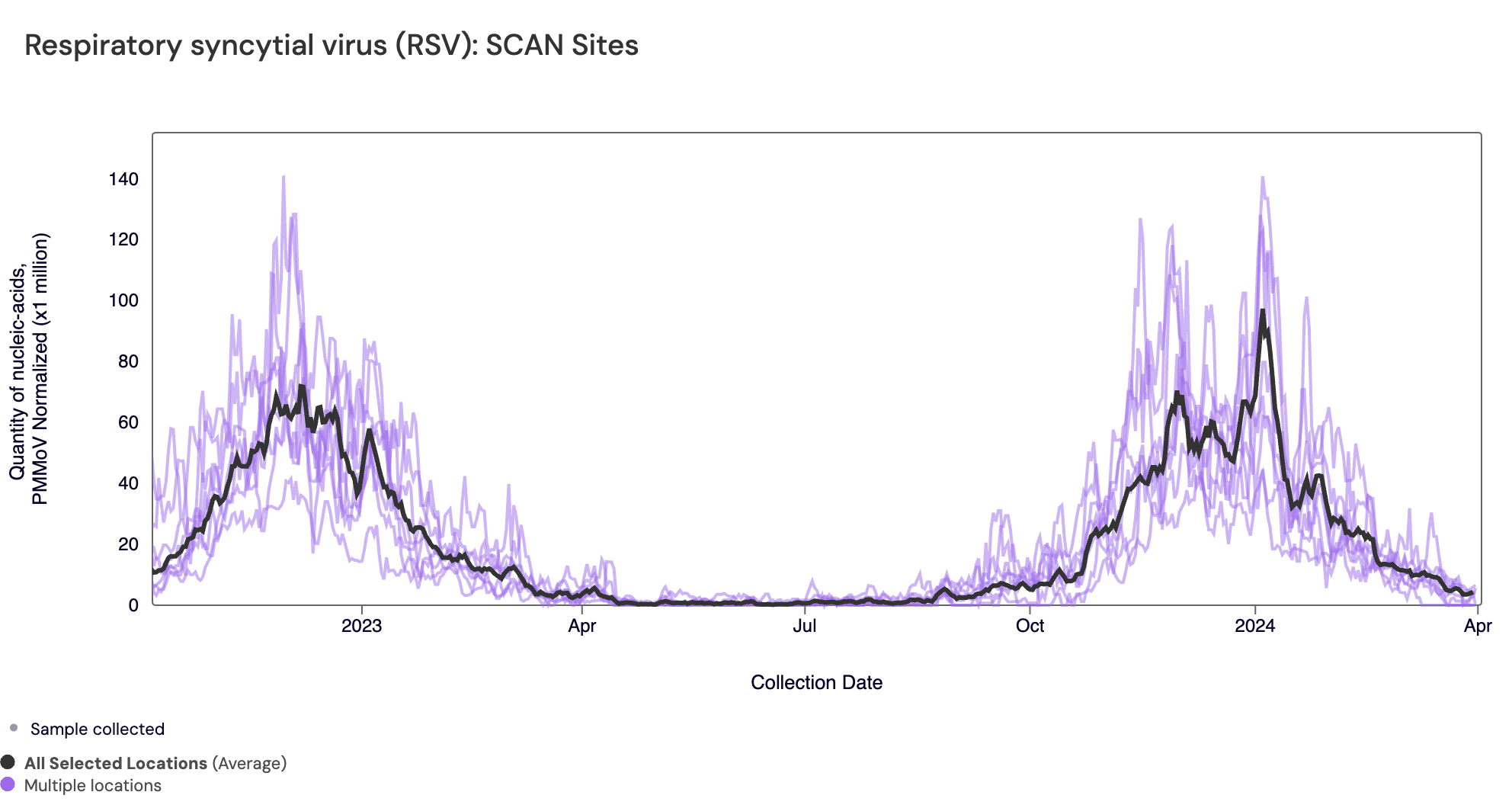 In the chart below (representing data from Sept 2022-present), the population weighted average line across all the SCAN sites is shown in black, and you can see the current concentrations relative to the peak RSV levels from last year. The link to the chart below is here if you would like to interact with it.