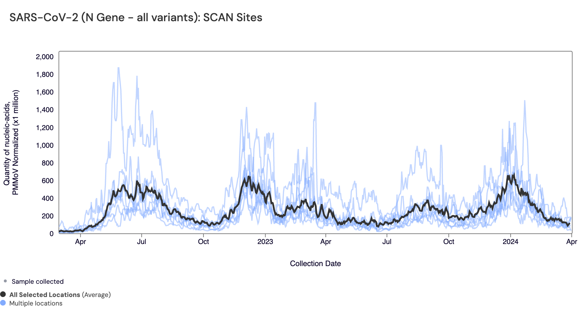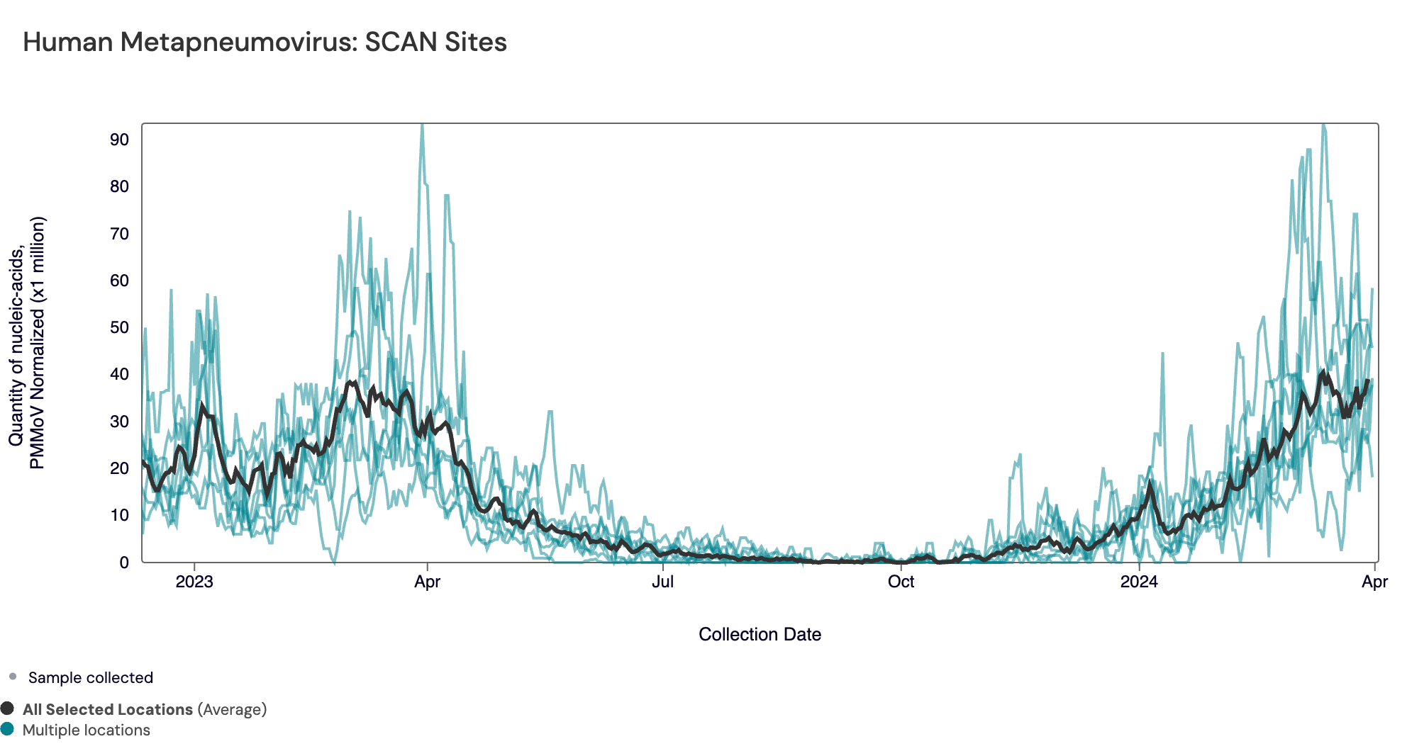 In the chart below, the population weighted average line across all the SCAN plants is shown in black (link here to this chart if you want to interact with it) since December 2022. Evident in the chart is the recent increase in HMPV concentrations across all SCAN sites.