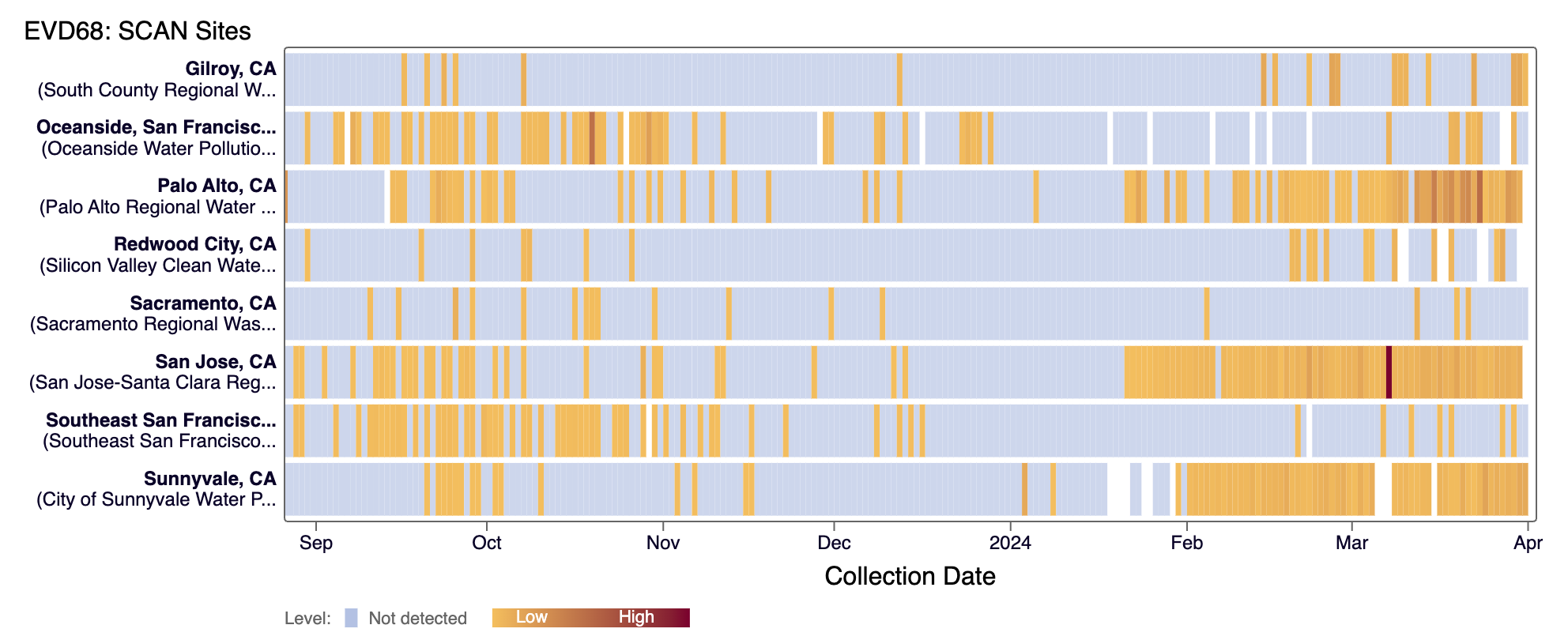 The heat map below shows all the SCAN sites as a row, and each date as a column since monitoring began in July 2023. The color blue means the sample was non-detect for EV-D68 RNA and the colors get darker with higher concentrations. White indicates no sample was collected. You can access the chart here.