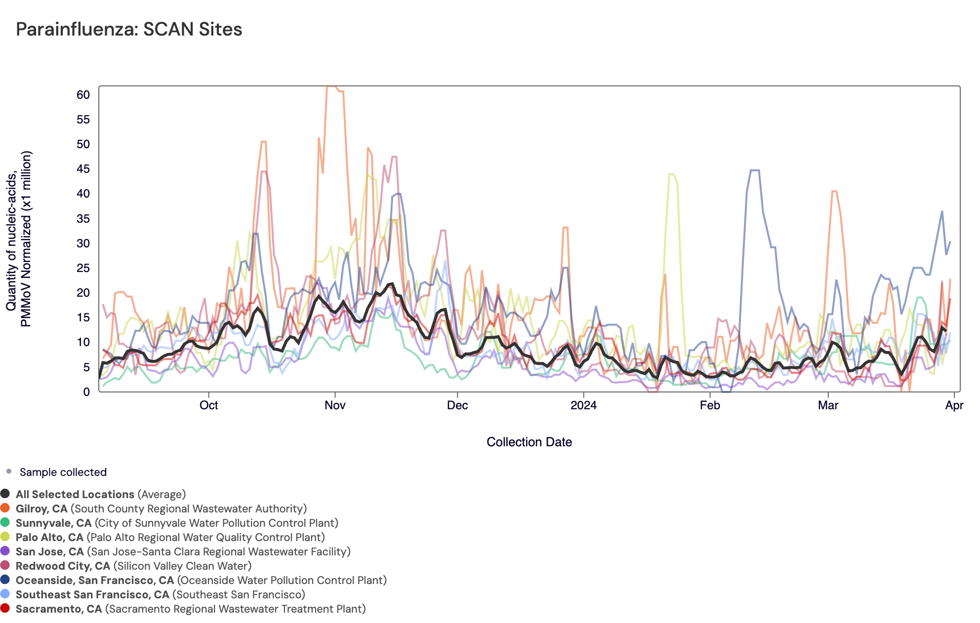 Parainfluenza RNA has consistently been detected in most samples collected from SCAN sites. The population weighted average across SCAN sites is shown in black. You can access the chart here.