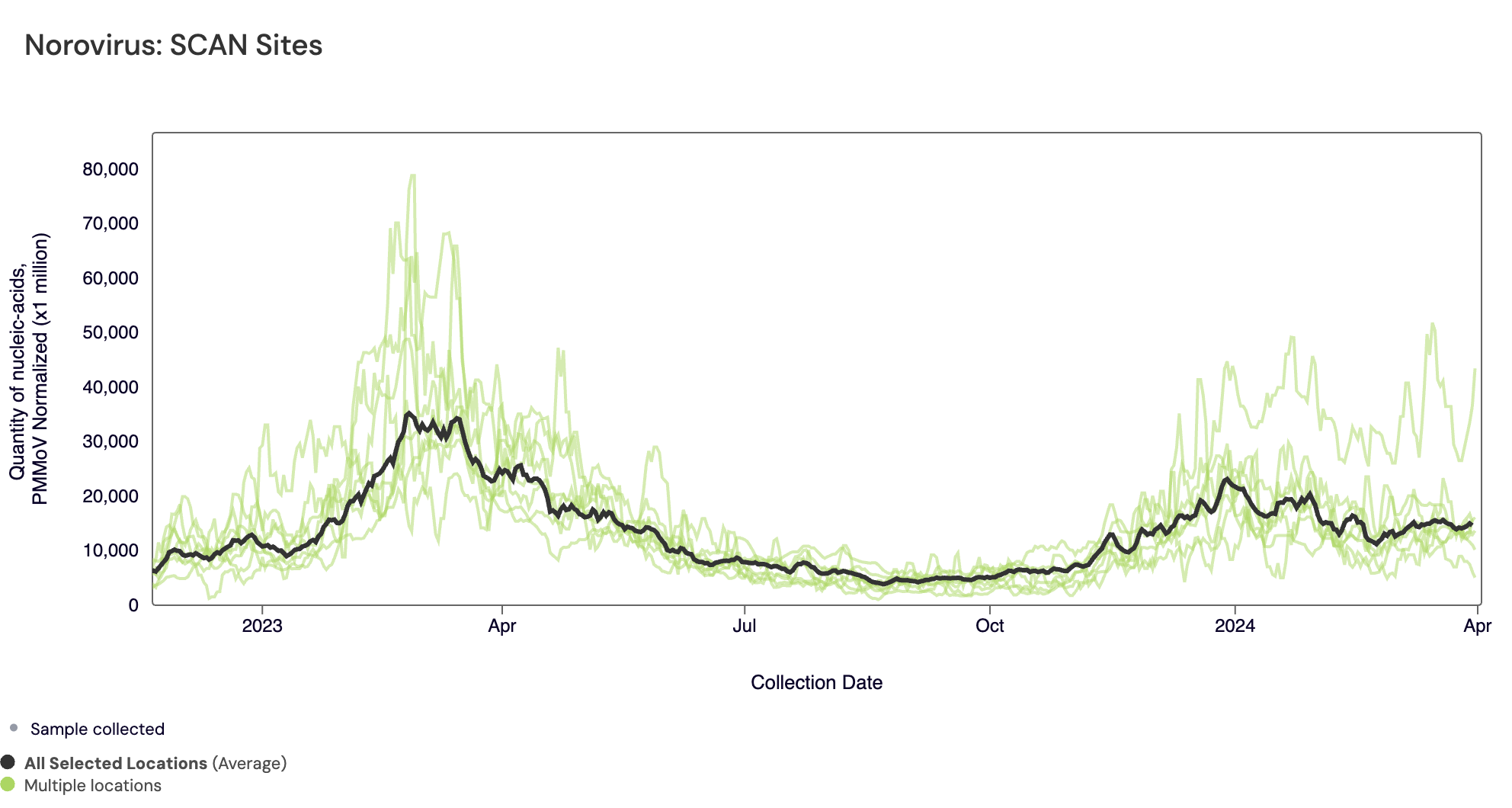 The plot below shows the Norovirus concentrations at the SCAN sites since we began monitoring in late 2022. The population weighted average line is shown in black. You can interact with the chart of all the plants at this link.
