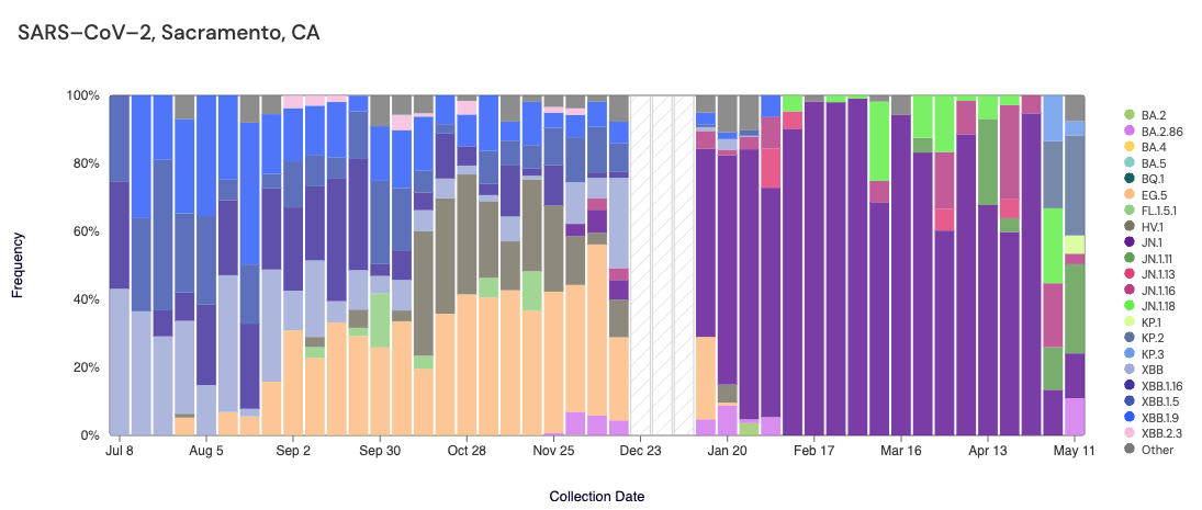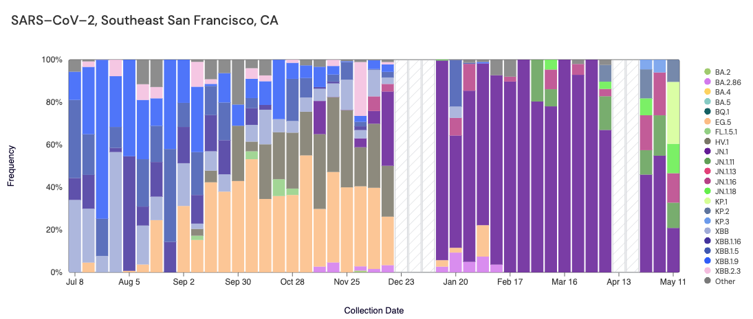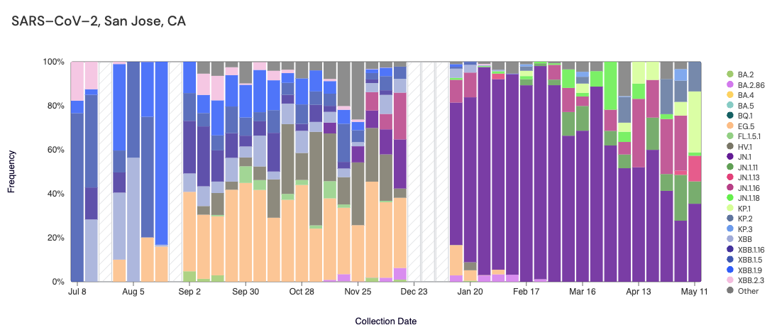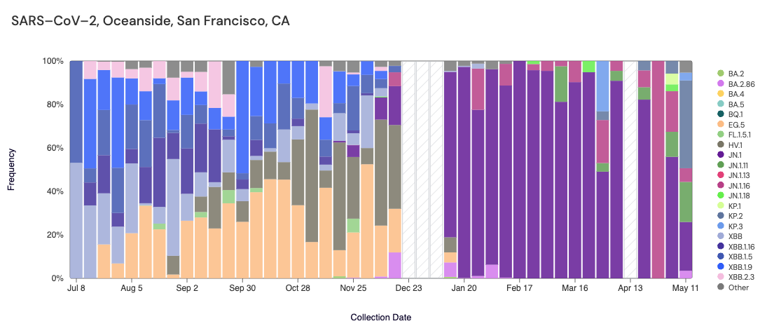 Below are plots from Oceanside SF, Sacramento, San Jose, and Southeast SF showing the relative proportions of different variants inferred from sequencing the entire genome of SARS-CoV-2. White and grey striped bars indicate no data is currently available for that week. In the most recent samples, we are starting to see greater portions of KP.1 (light green) and KP.2 (slate blue).Note that the sequencing data are always from samples taken between 1-2 weeks ago (in this case, May 11, 2024).
