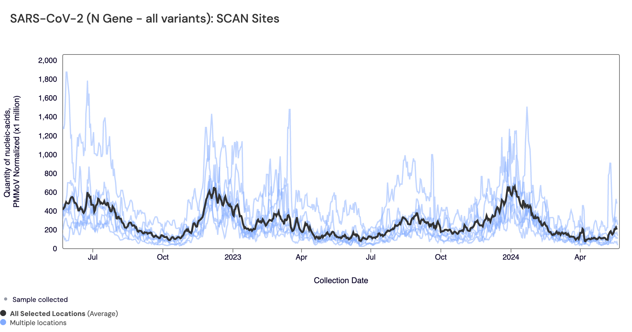 Below are all the data from all the SCAN plants for the last two years. You can access the graph here. The population weighted average across the SCAN plants is shown in black. The population weighted average shows a recent increase compared to the lower concentrations we measured in early spring 2024.
