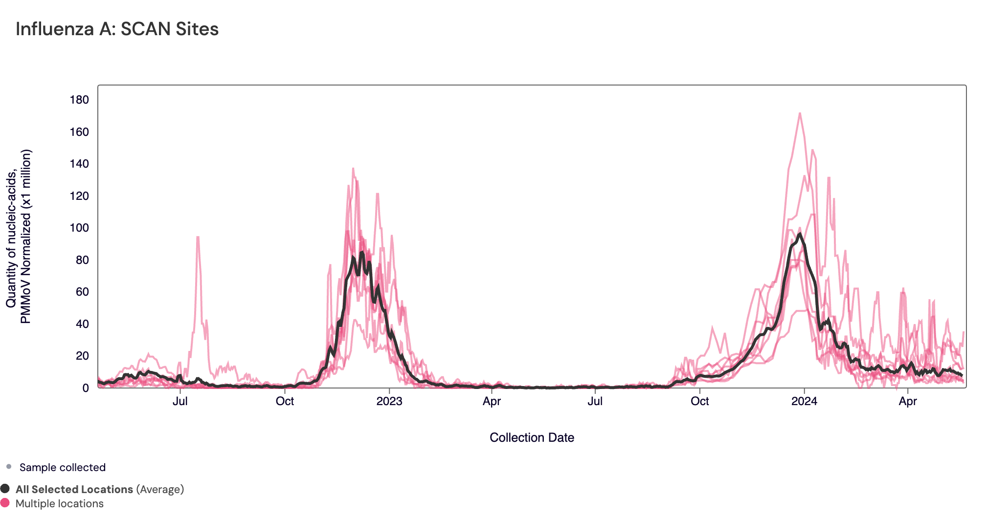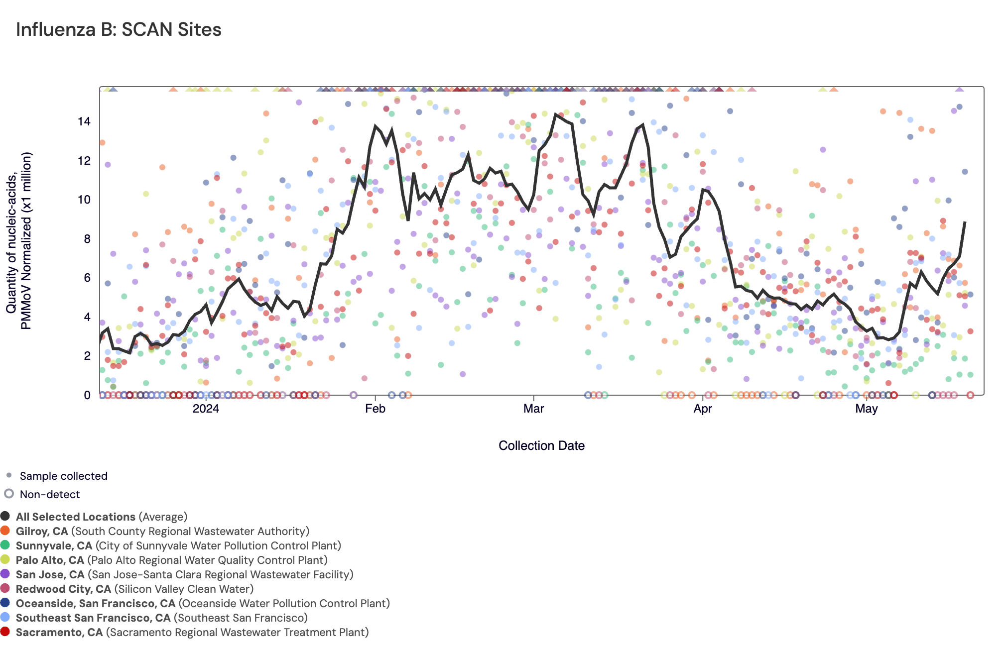Influenza A (IAV) RNA: Below are all the IAV data from all the SCAN plants for the last two years. You can access the graph here. The population weighted average across the SCAN plants is shown in black. All SCAN sites are still in onset for IAV are are continuing to come down from the peak seen at the end of 2023/beginning of 2024 (but we are continuing to see positive detections for IAV across all sites).