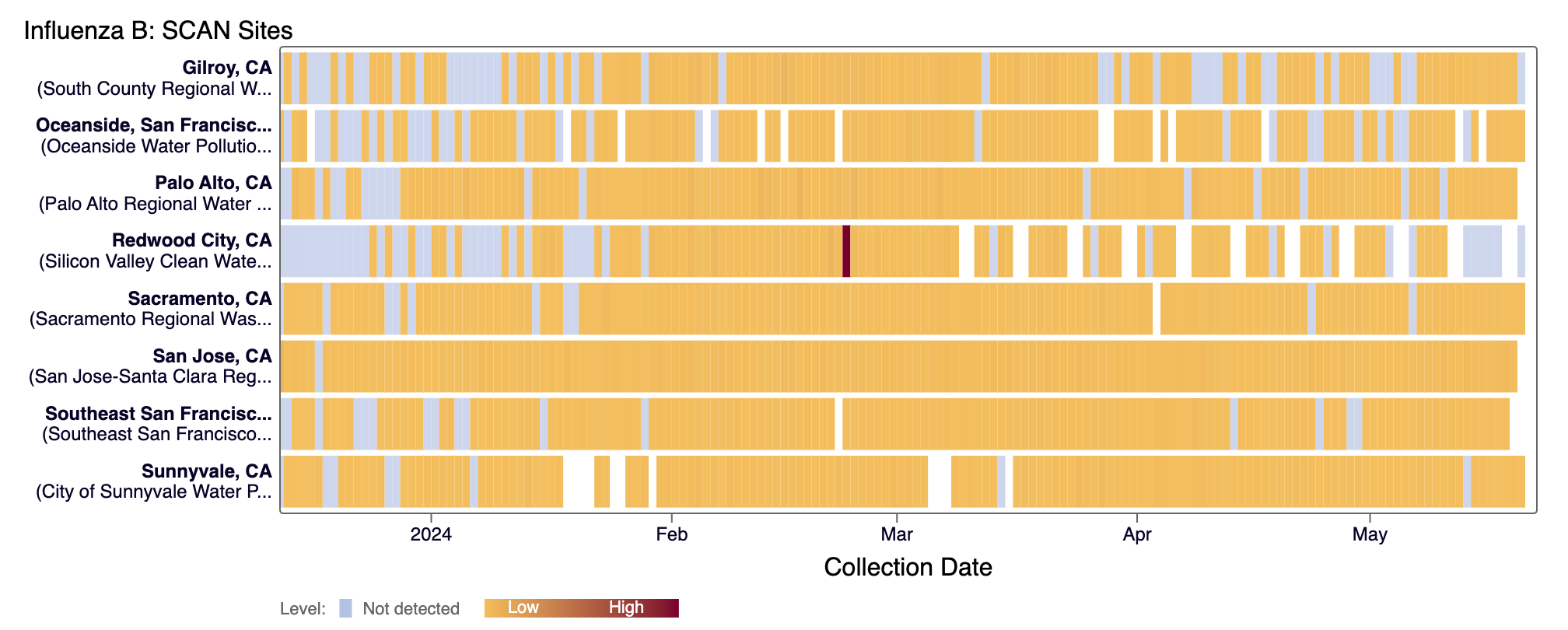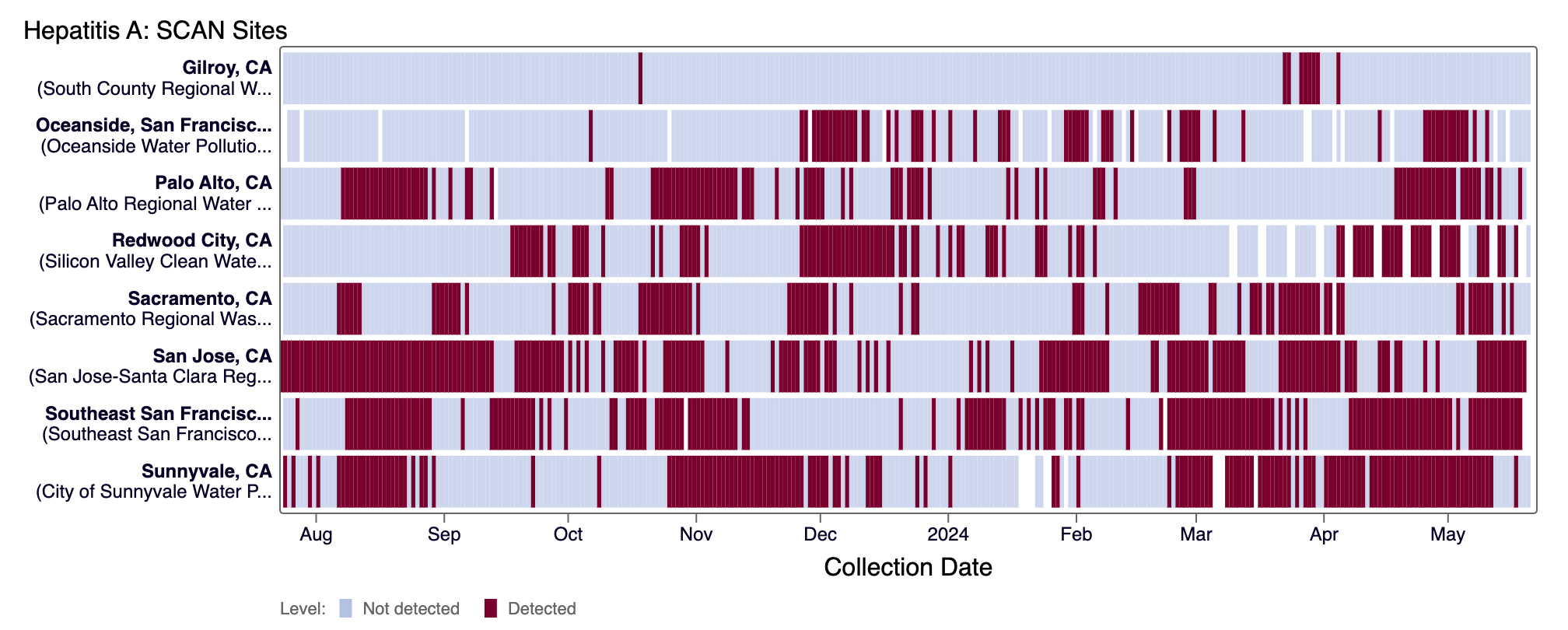 Hepatitis A RNA has been detected frequently at all SCAN sites in the last 10 days (minus Gilroy and Oceanside SF). Below are the current wastewater categories for the SCAN sites (the category is determined by the frequency of detection):