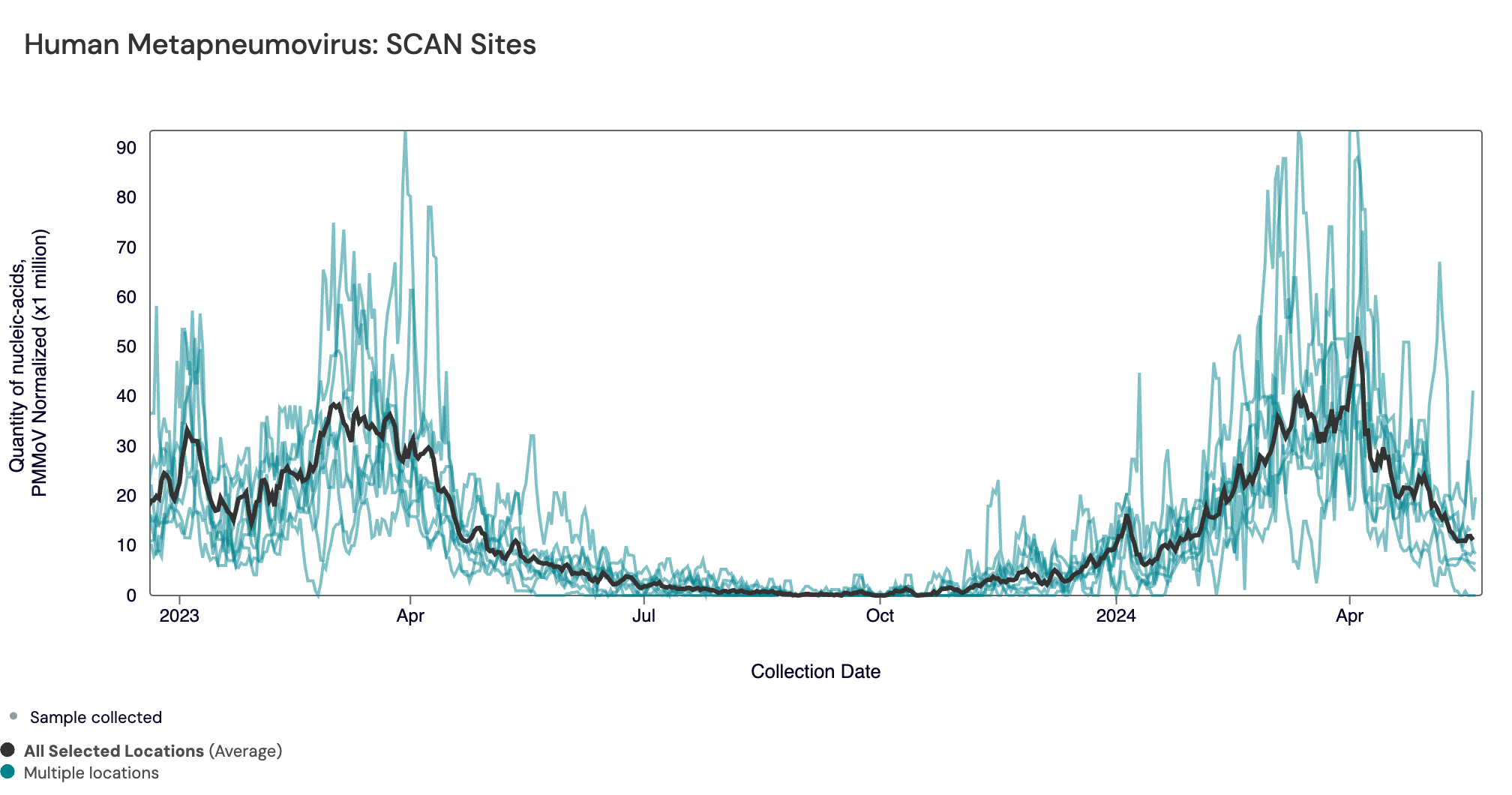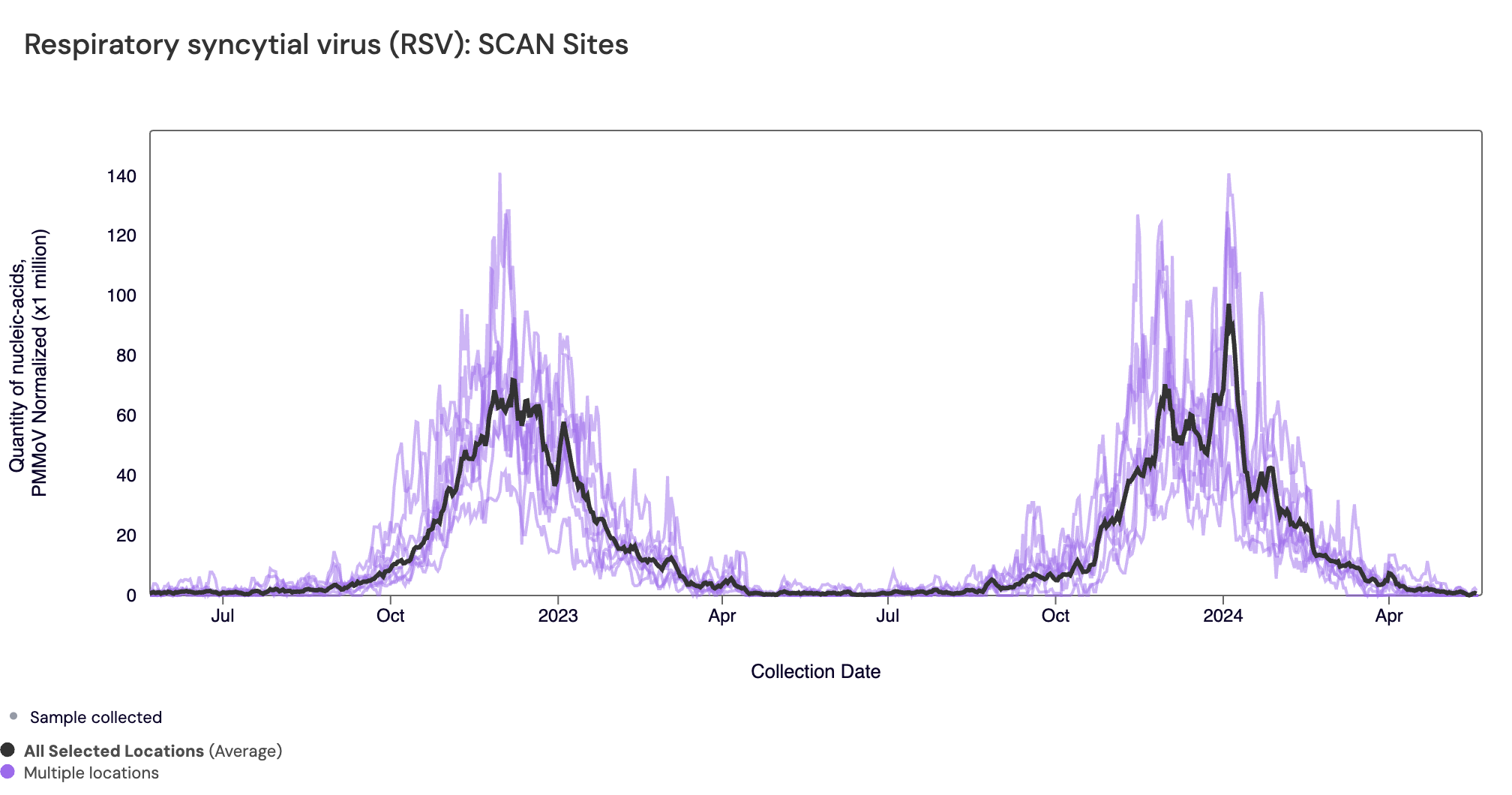RSV RNA concentrations have decreased to low levels. In the chart below (representing data from the past 2 years), the population weighted average line across all the SCAN sites is shown in black, and you can see the current concentrations relative to the peak RSV levels from last year. The link to the chart below is here if you would like to interact with it.