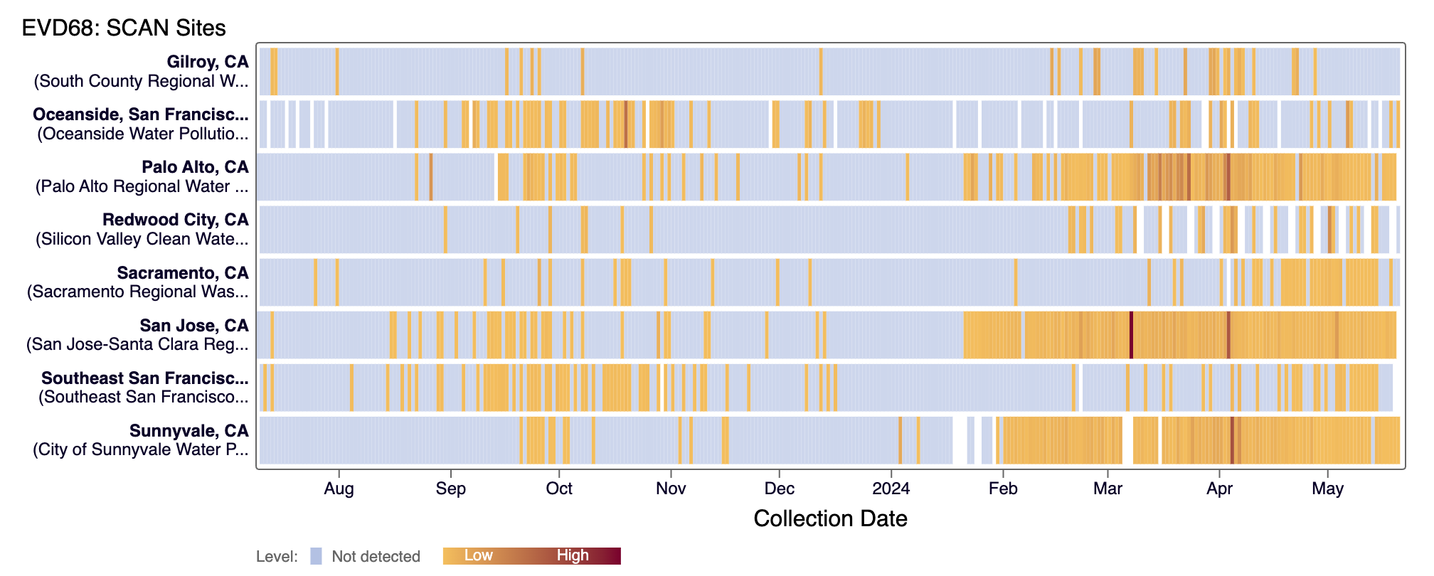 EV-D68 RNA was detected at all SCAN sites from samples collected in the last 10 days (expect Gilroy). Below are the current wastewater categories for the SCAN sites (the category is determined by the frequency of detection):