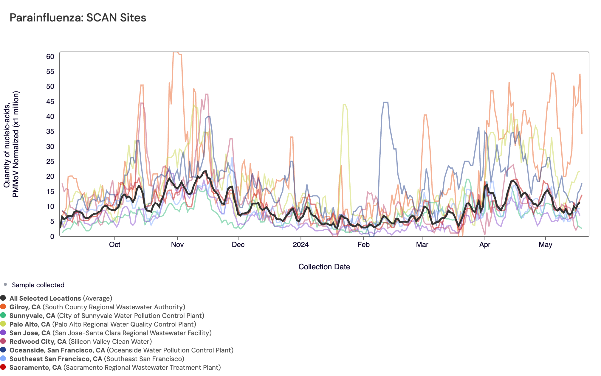 Parainfluenza RNA has consistently been detected in most samples collected from SCAN sites. The population weighted average across SCAN sites is shown in black. You can access the chart here. As a reminder we are temporarily pausing Parainfluenza RNA measurements while we run the H5 specific influenza assay.